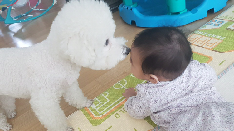 아기의 시간은 흘러가는데 강아지에게 흐르는 시간은 멈춘 것 마냥 천천히 흐르고 있다.