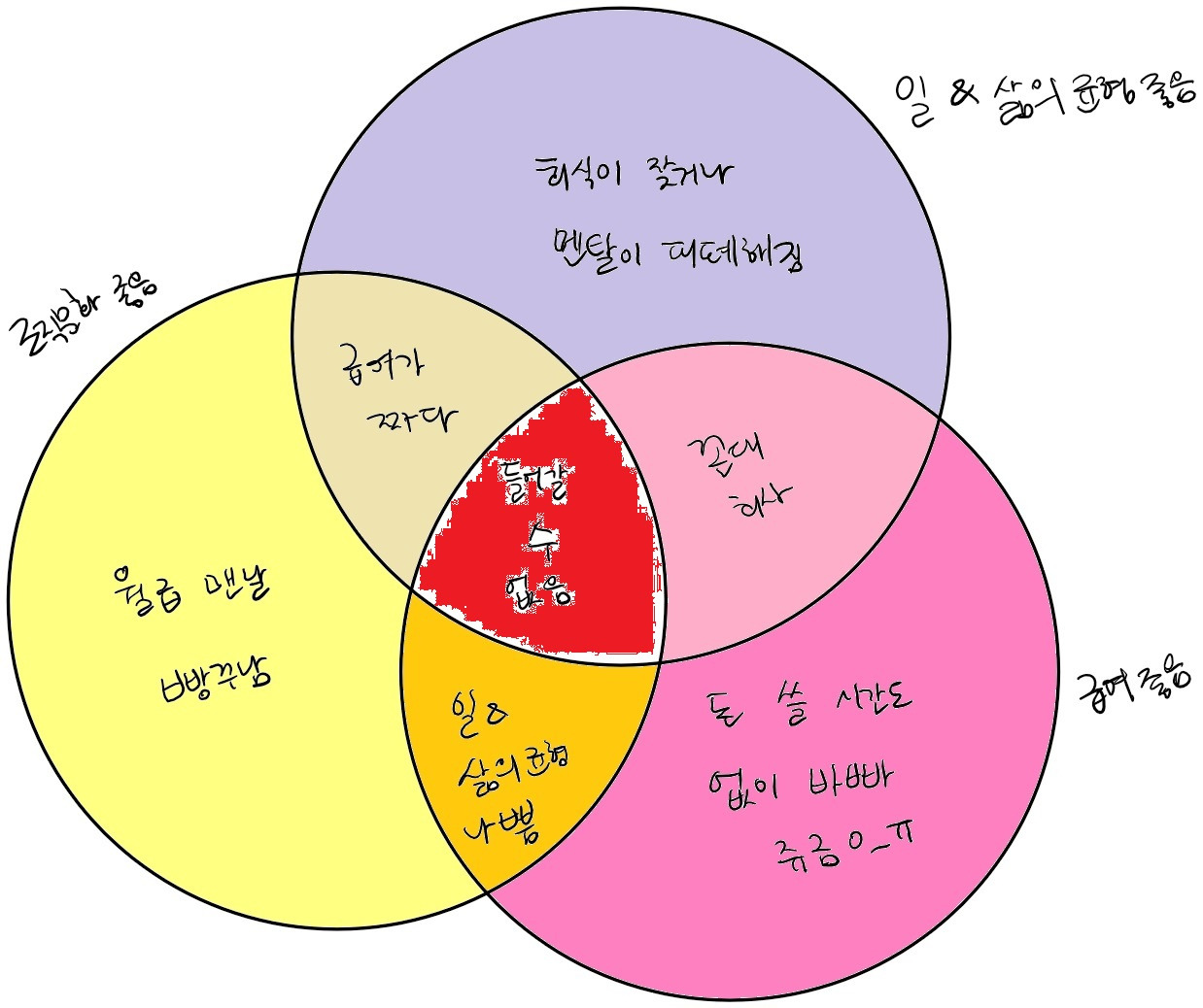 슬프게도, 일-삶의 균형, 조직문화, 급여 수준은 trade-off 되는 경우가 많다. 일-삶의 균형이 좋고 조직문화가 좋으면 급여 수준이 낮다거나, 급여 수준이 높고, 조직문화가 좋으면 일이 힘들어서 그렇다거나 하는 식으로. 누구나 원하듯 글로벌 IT기업과 같은 사무실에 열정적인 동료들, 거기에 업계 최고 수준의 연봉을 주는 회사는 실로 적디 적다. 아래의 벤다이어그램이 이 내용을 잘 설명해 줄 것이다.