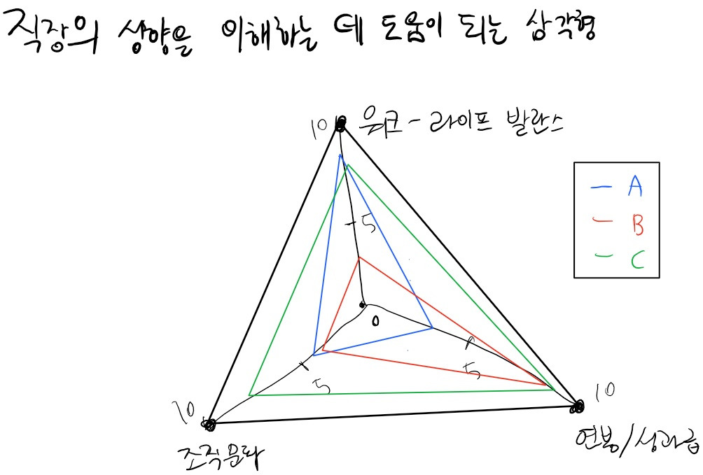 삼각형 그림에서 보이는 A, B, C는 이 세 가지 성향을 기업에서는 어떤 식으로 갖고 있는지를 알려주는 그림이다. A 기업은 워크-라이프 밸런스는 최고다. 출퇴근 시간 칼같이 맞춰도 뭐라 하는 사람 없이, 낮은 업무강도로 일을 할 수 있다. 그러나, 일이 안 고달픈 만큼, 조직 문화가 속된 말로 ㅈ같으며, 급여 수준도 낮은 편이다. 반면 B 기업은 돈은 많이 받을 수 있다. 그러나 그만큼 조직 기강이 강해 내부에서 차려야 하는 예절 등 이상하고 다양한 법규들과 강한 업무강도로 본인 삶이 없다. C 기업은 앞서 말한 기업들에 비해 세 가지 조건들을 고루 갖춘 편이다. (물론 불필요한 내용이라 생각해 적지는 않았지만, 들어가기는 힘들다)