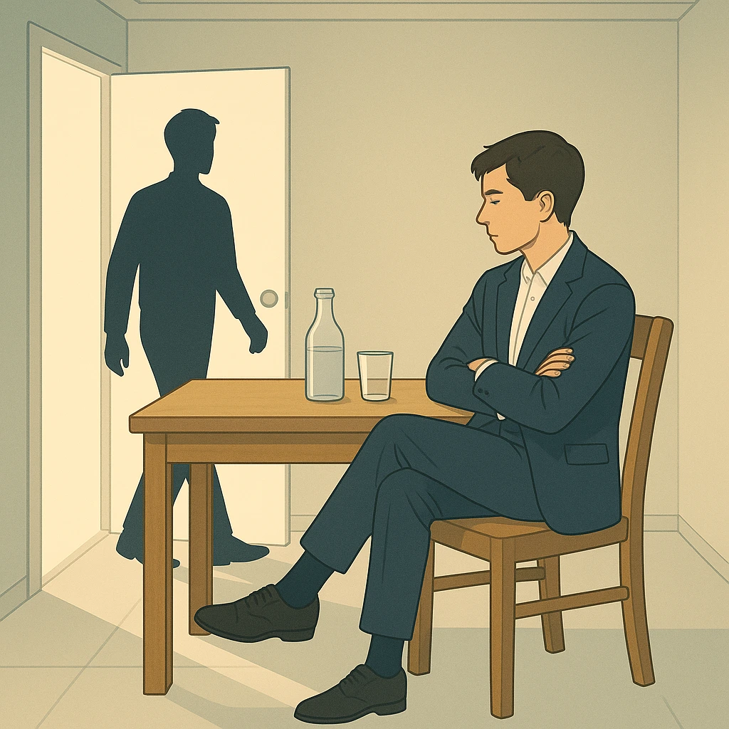 네모난 4평 룸. 밝은 주광색 천장 빛 아래, 은은한 고기 냄새가 배어있다. 우드톤 책상 위, 물 한 컵. 너는 팔과 다리를 꼬고, 고개를 비스듬히 기울인 채 앉아 있다. 오래 기다렸는지 꼬인 발목이 빠르게 흔들린다.