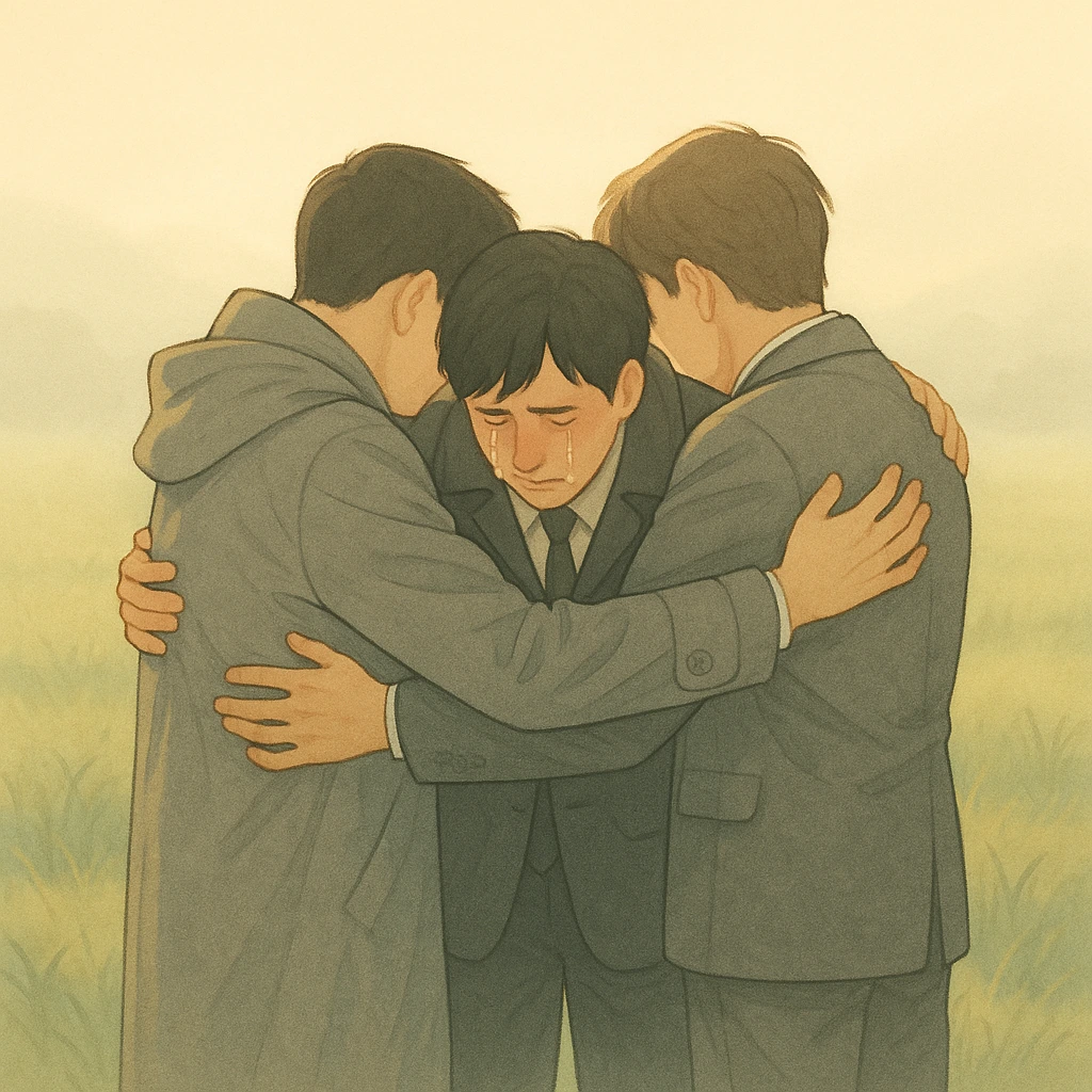발인 날, 아침부터 내리는 비는 장지에 도착해서도 멈추지 않았다. 재호가 먼저 아버님 사진과 함께 걸어갔다. 우린 재호 아버님을 감싼 하얀 천을 들고 뒤따라갔다. 잘 관리된 잔디였지만 발을 옮길 때마다 질퍽거렸다. 행여 불편하실까 봐, 떨리는 손으로 천을 더욱 꽉 쥐었다. 걸을 때마다 풍겨오는 비 냄새는 진흙과 섞여 코를 찔렀다.