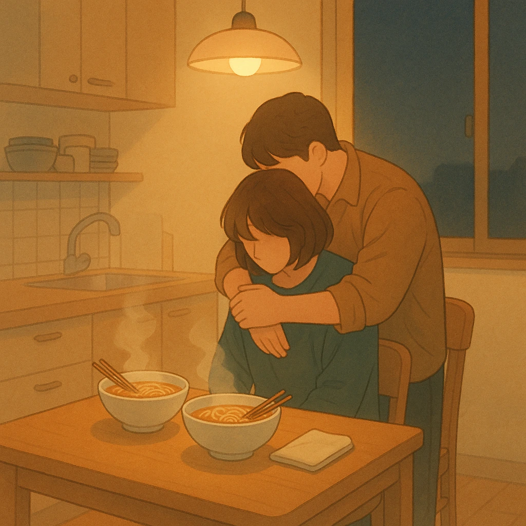 “고생했어.” 그 말에 그녀가 내 어깨에 머리를 기댔다. 뜨거운 라면 김처럼, 우리 사이엔 따뜻한 위로가 피어올랐다.