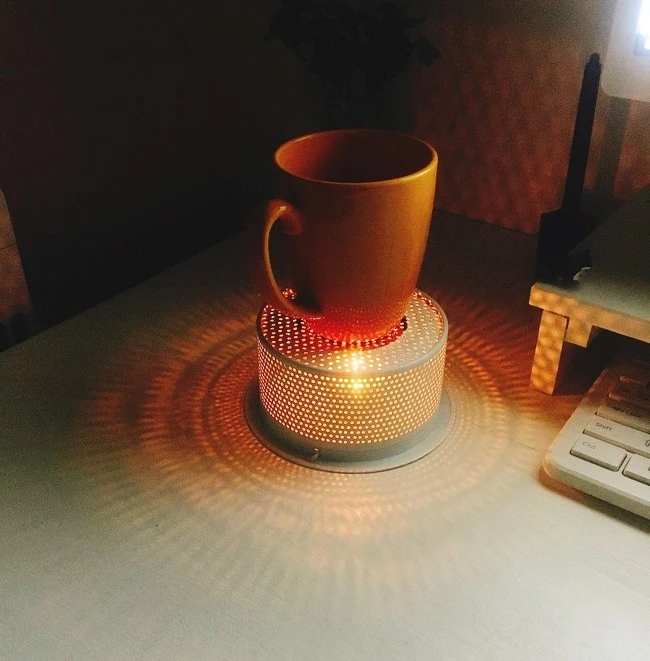 원래 스테인리스 컵 받침 아래 초를 켜서 차를 데웠는데 불안정해 보여서 티 워머를 사려고 찾아봤지만 가격은 엄청 비싼데 효율은 떨어지는 모양들 밖에 없었다. 그래서 그냥 다이소에서 개수대 거름망 사다가 아트릴 물감으로 칠했다.