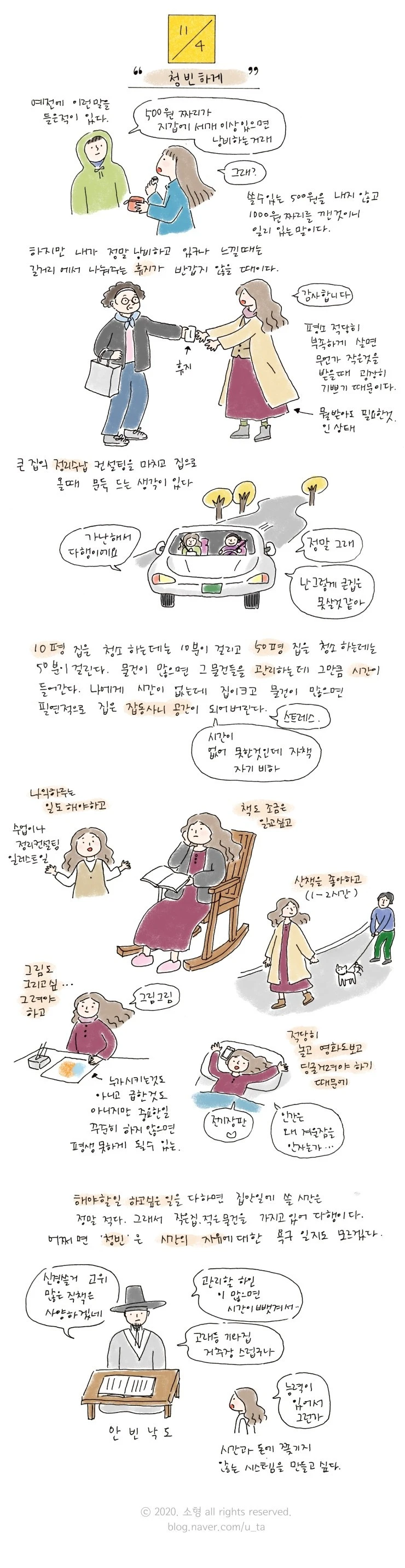 살림. 그야말로 나를 살린다는 감각이 의식주의 돌봄 안에 있다. 그런데 집이 크면 그 시간이 너무 오래 걸린다. 주객전도로 나 살림한다고 애쓰다가 죽을 판이다. 청빈하게. 적은 것을 먹고 적은 물건을 가지고 작은 집에서 살면 살림에 큰 시간을 안 들일 수 있다. 그만큼 여유 시간이 많아진다. 큰집보다 자유 시간이 좋다.살림은 싫지 않아도 살림보다 하고 싶은 일이 많으니까. 공간을 늘리기보다 시간을 늘리고 싶다.