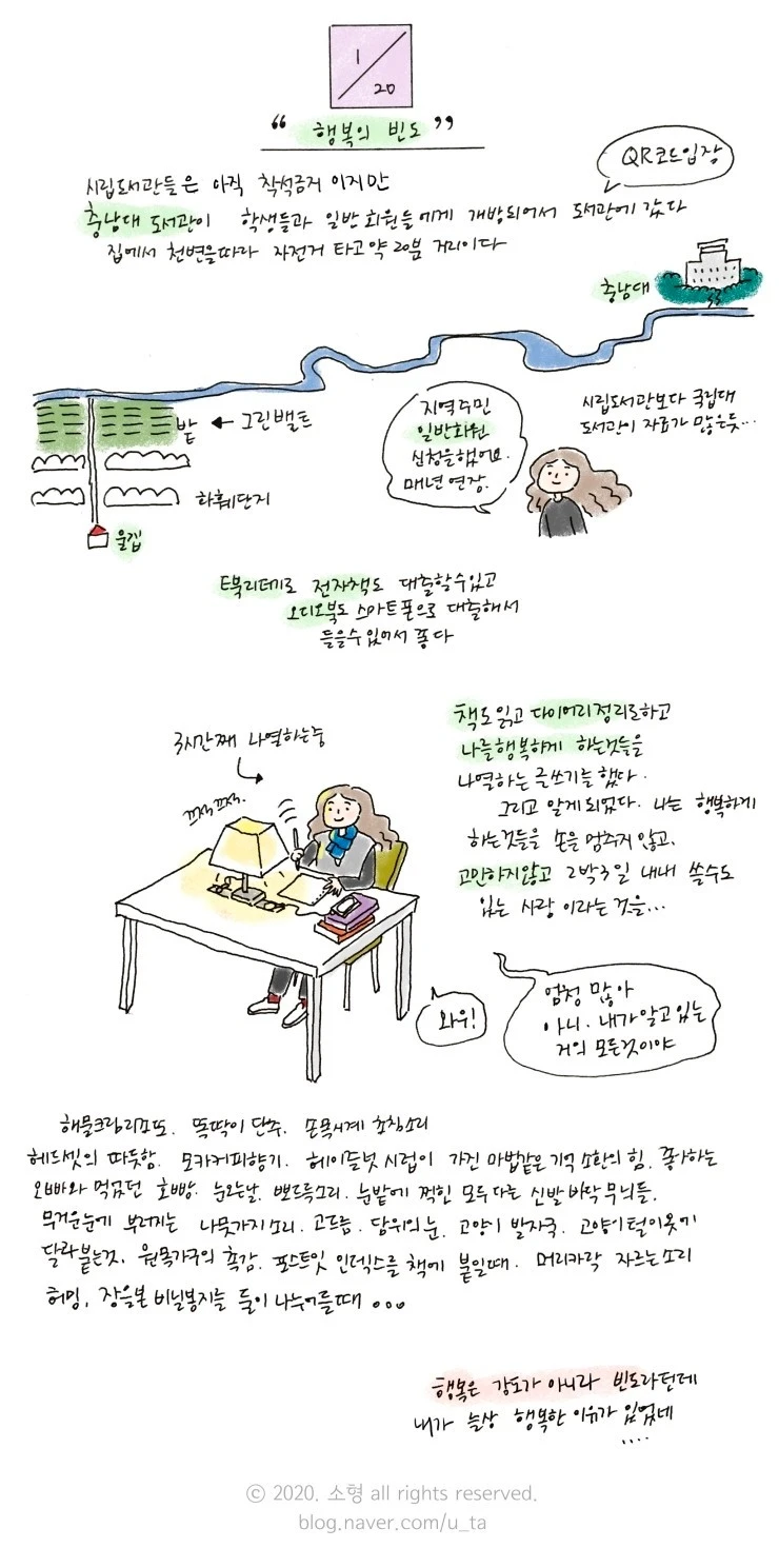 별거 아닌 걸로 감탄하고 즐거워해서 주변에서 어리둥절해 하긴 하지만..즐거움 기쁨같은 행복을 이루는 감정들은 금방 휘발되기 때문에 행복은 강도가 아닌 빈도라는데내 생각에는 빈도를 넘어 상태라는 생각이든다.