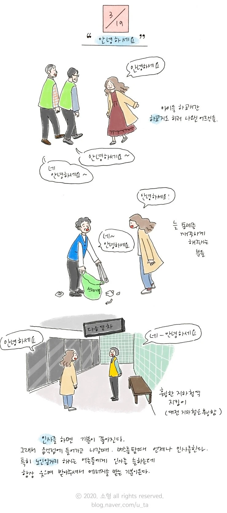 인사하는 것을 좋아한다. 상점에 들어오고 나갈 때 전단지를 받을 때, 건물을 청소하는 아주머니께, 봉사하시는 분들께