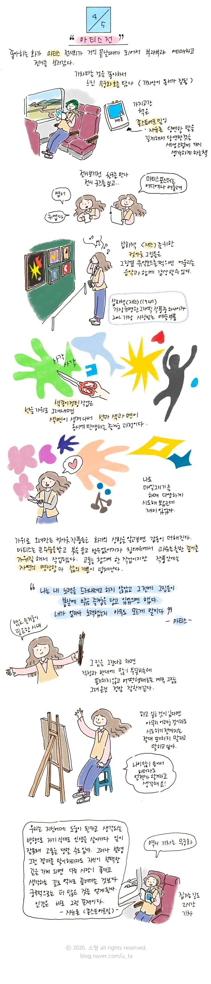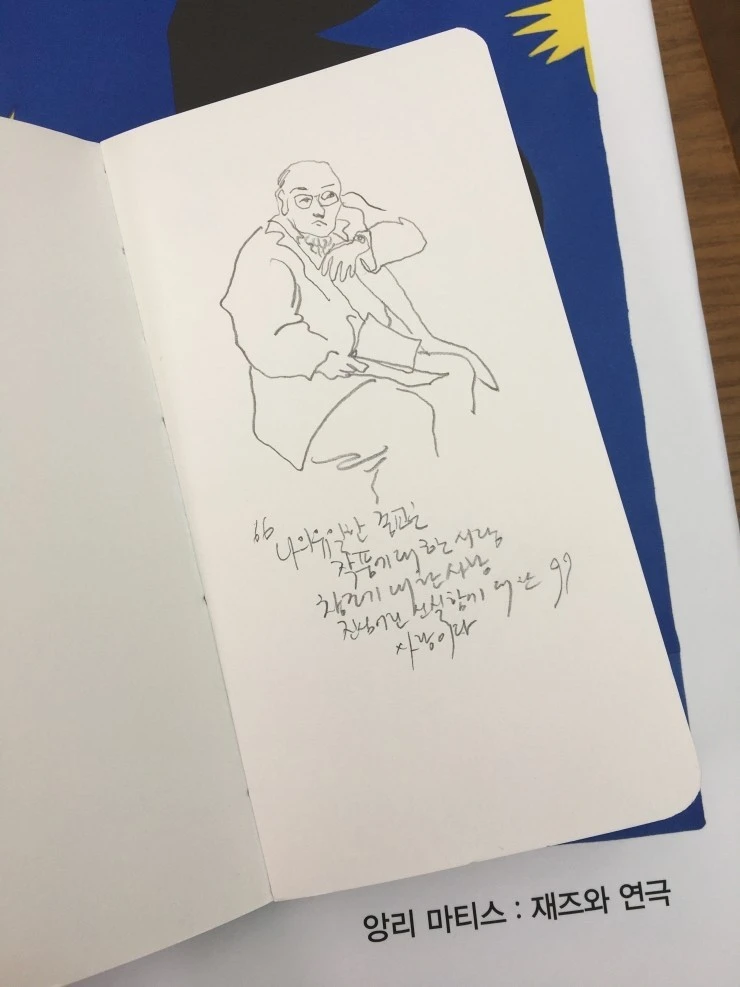 뭔가 평소 내가 지향하는 그림에 대한 생각과 비슷해서 위로를 받았다. 발끝만큼이라도 따라가고 싶다. 일필휘지로 그리는 마티스의 선들은 낙서 같고 쉬워 보여도 흉내 낼 수 없는 생동감과 따듯함이 있는데 많이 관찰하고 수없이 반복해서 그려서 자기중심적 에고는 사라지고 그리는 대상에 대한 선명한 공감과 개별성에 대한 존중만 남은 상태로 슥삭 그려내서 마음이 담긴 선이 나오는 거 같다.
