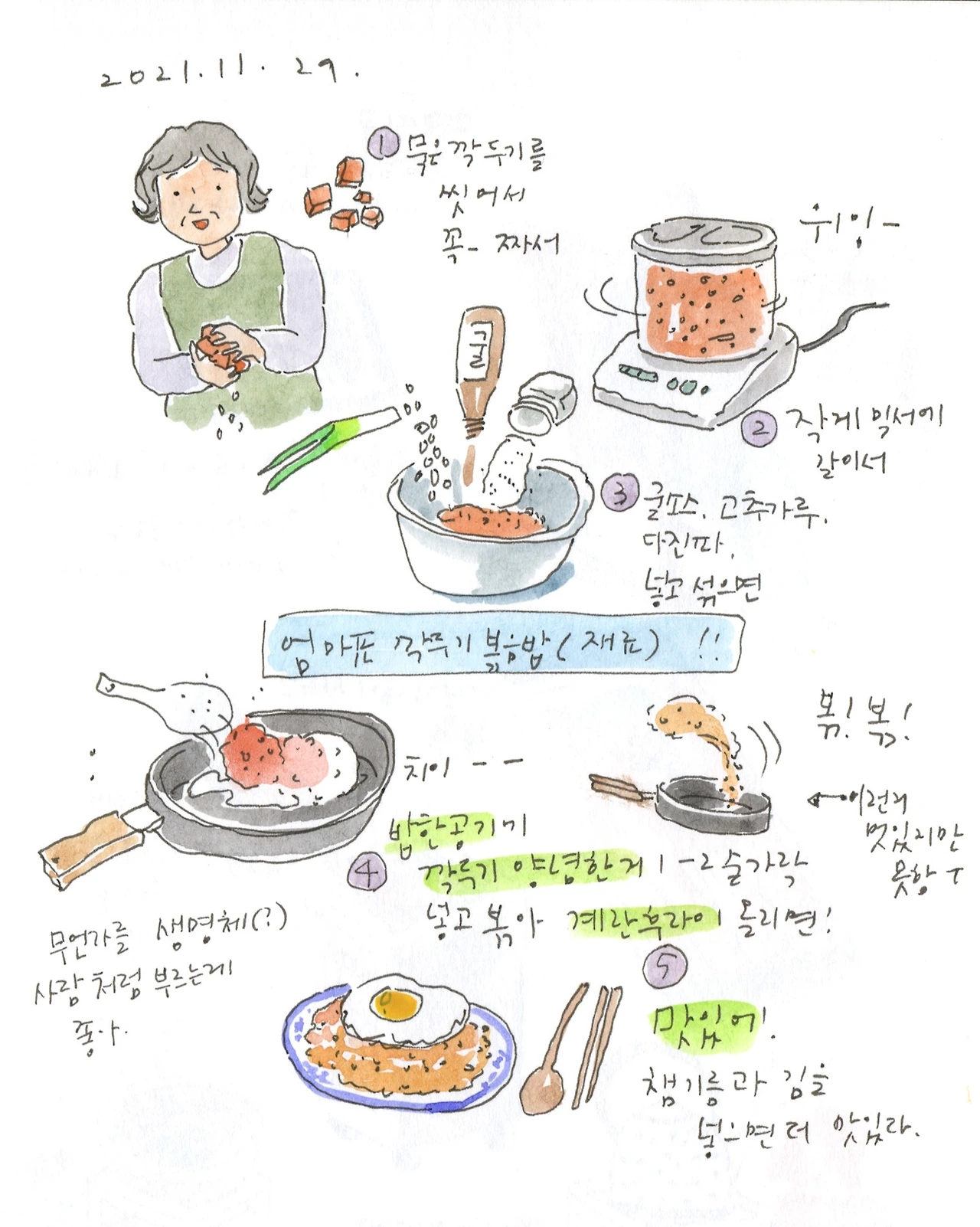 엄마는 며칠 전 어디선가 받아 온 가을무로 새 깍두기를 버무리셨다. 그리고 묵은 깍두기를 갈아서 깍두기 볶음밥 재료를 만들어 싸주셨다. 오늘 먹어보니 두어 숟가락 넣고 볶으면 볶음밥이 되는 자취에 최적화된 반찬이다.
