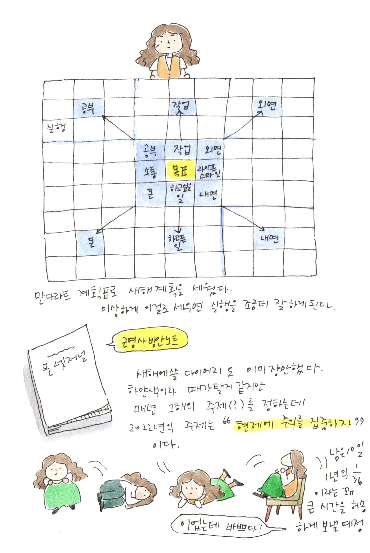 매년 연말이면 꺼내 드는 다이어리에 가로 9칸 세로 9칸을 나누어 항목별로 세부 계획을 짜는 만다라트 계획표를 작성했다.