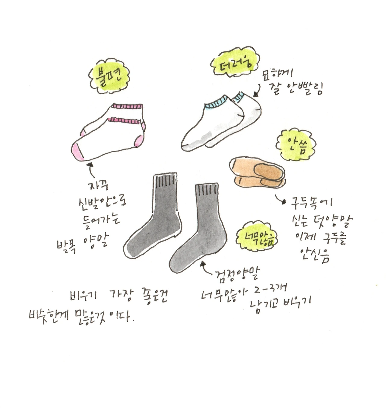 집집마다 양말과 스타킹은 얼마나 많이 가지고 있을까? 예전에 정리수납 컨설팅을 갔을 때 놀란 게 사람들이 가지고 있는 양말과 스타킹이 정말 많다는 것이었다. 나도 비우기 전에는 많이 가지고 있었다. 왜 그렇게 많이 가지고 있었을까? 10개 묶음으로 사기도 하고 예뻐서 사기도 하고 선물 받기도 해서 점점 늘어나는데 비우지는 않았다. 신기에 불편할 정도로 발목 고무줄이 늘어나도 잘 비우게 되지 않았다. 그냥 나는 물건을 쓸 만큼 쓰고 나서 처분하는 습관 자체가 없었다. 부모님이랑 살 때는 엄마가 버려주셨는지 모르겠지만 혼자 살게 되니 이사 갈 때나 돼야 물건을 정리하곤 했다. 지금은 양말 10여 개가 전부이다. 그날 신고 샤워하며 빨아서 널어두면 전혀 부족함이 없다. 그리고 그중 낡은 것이 생기면 하나를 버리고 하나를 산다. 모든 양말이 예쁘고 맘에 드는 것이라서 무얼 신어도 기분이 좋다.