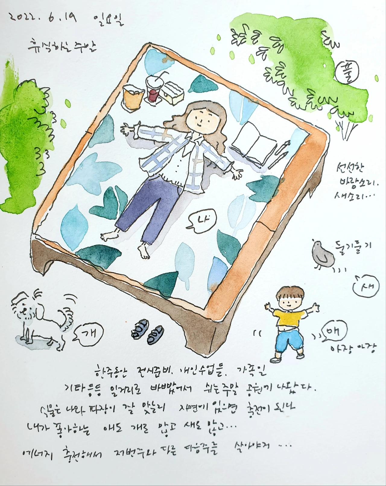 저녁에 약속이 있는 날이라 오전이랑 오후 시간을 공원에서 보냈다. 자연은 나랑 기운이 잘 맞는지 자연 속에 있으면 피로가 회복되고 정신도 건강해진다. 다음 주에는 또 여러 가지 일이 있었고 해야 하는 예정된 일이 있어서 조바심도 났지만 그럴수록 한번 쉬어가는 여유가 필요하다. 그 어떤 순간에도 '나는 나를 돌보고 있어' 하고 나에게 알려주는 것 만으로 충분하다.