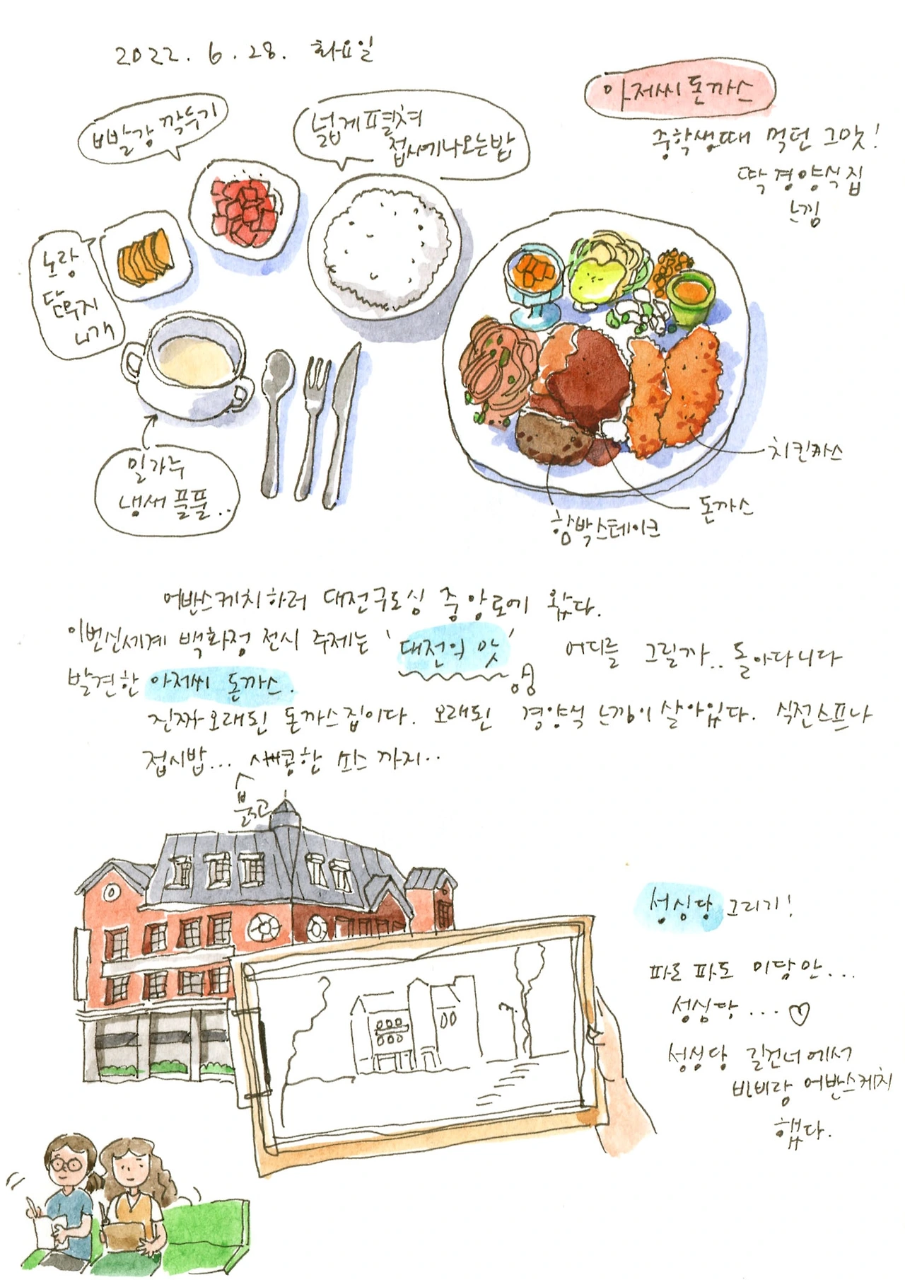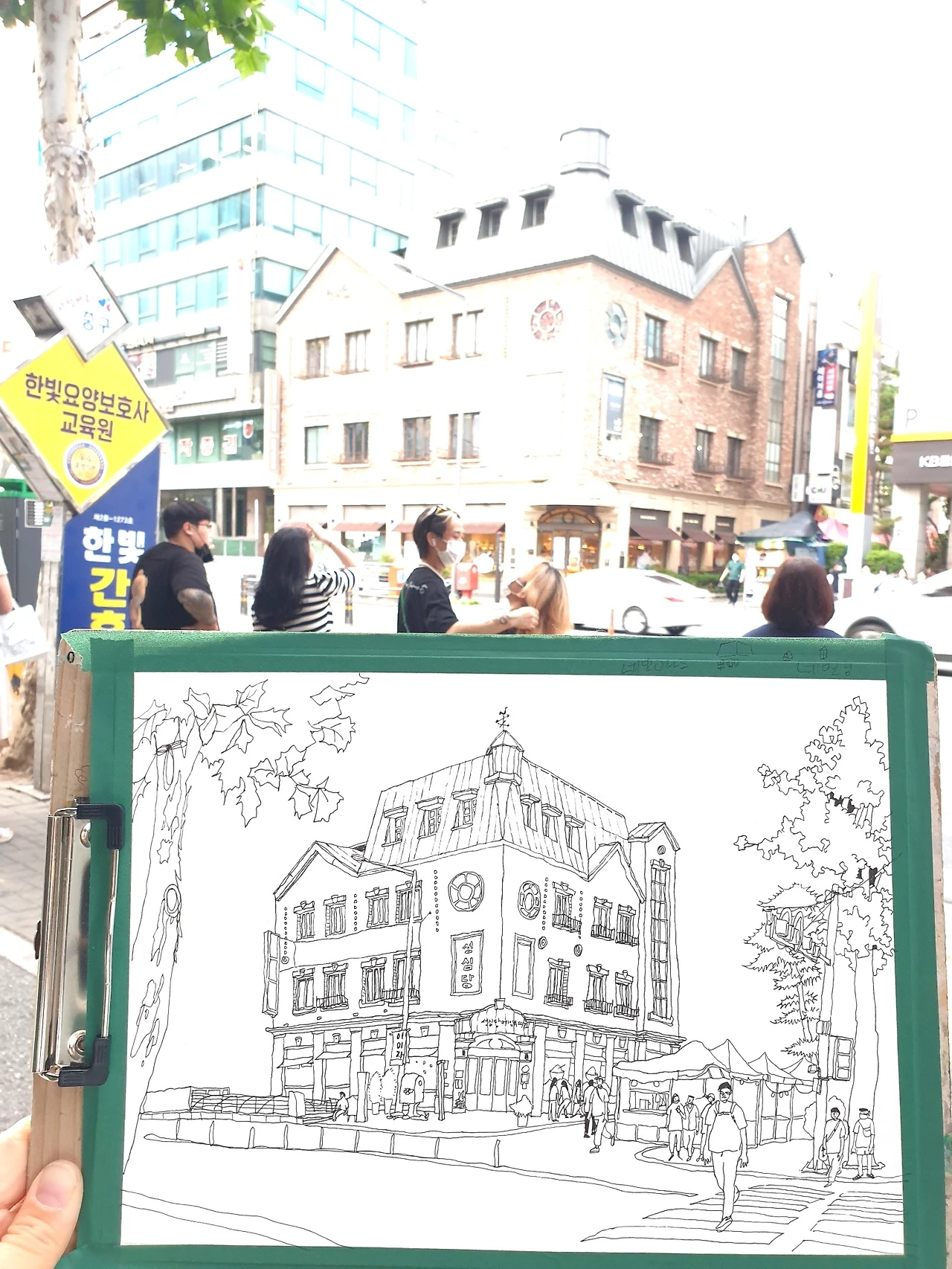 성심당 옆 건물을 생략하고 성심당 주변의 노점들을 그렸다. 으리으리한 성심당 주변에는 오래된 노점들이 옹기종기 늘어서 있다. 성심당에서 노점 분들께 수돗물을 쓰게 해 드리고 화장실도 공유해 주신다고 한다. 성심당 역시 60년 전 노점으로 시작한 기업이라 그런가 보다. 성심당은 이제 아주 큰 회사이다. 빵집으로 성심당 본점, dcc 점, 롯데백화점 점, 대전역점. 그리고 케이크 부티크, 성심당 옛 맛 솜씨 매장이 따로 있고, 패밀리 레스토랑 테라스 키친, 플라잉 팬, 경양식집 삐아또, 자가제면 우동집 우동야, 브런치&키즈 베이킹 카페 오븐 스토리.. 전부 성심당이 운영한다. 하지만 여전히 상생의 마음을 가진 멋진 기업이다. 거대 시장 주변에는 작은 점포들이 문을 닫고 망해가는 이야기를 많이 듣는데 성심당은 쇠락해 가는 구도심에 사람을 불러들이고 있다.