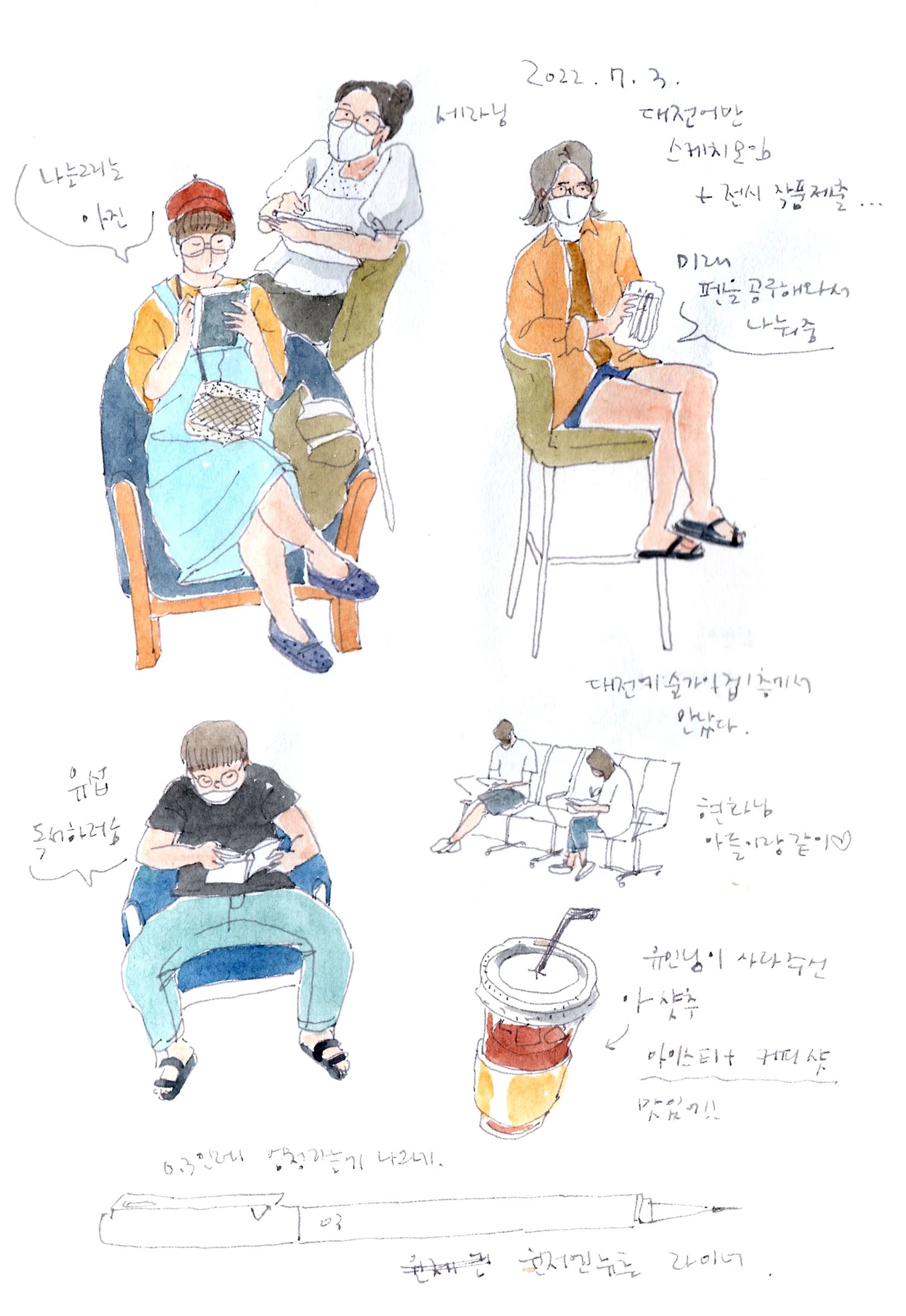 필통도 그림용 필통을 들고 갔어야 하는데 필기용 필통을 챙겨갔다;; 그래도 그 안에 회색 라이너가 있어서 소소하게 그림 그리고 채색은 집에 와서 했다. 그 와중에 책은 또 챙겨가서 구석에서 책을 읽었다.