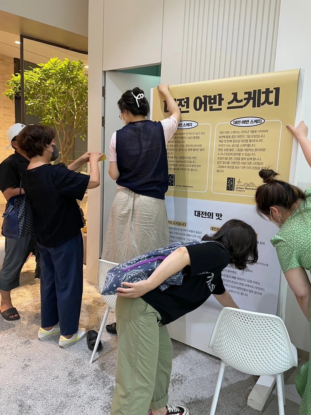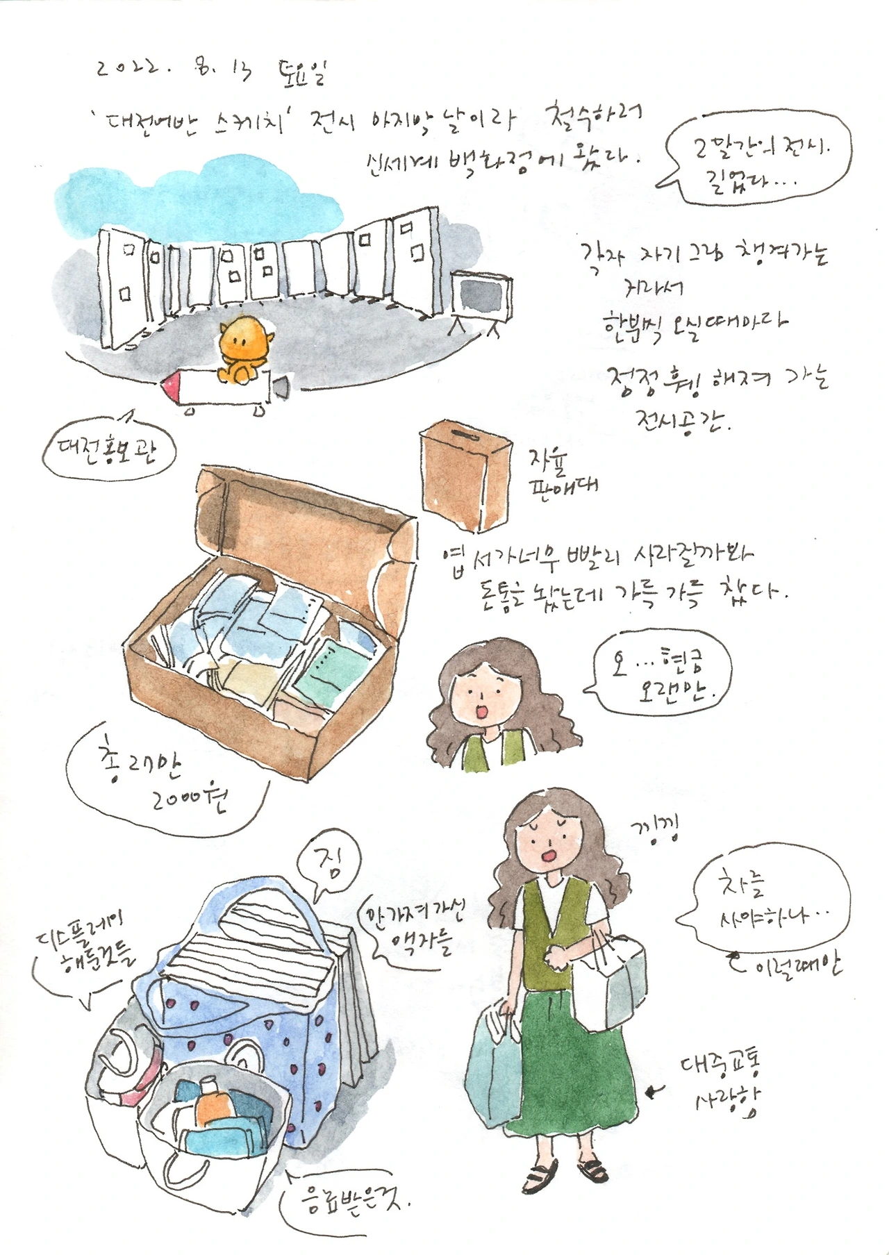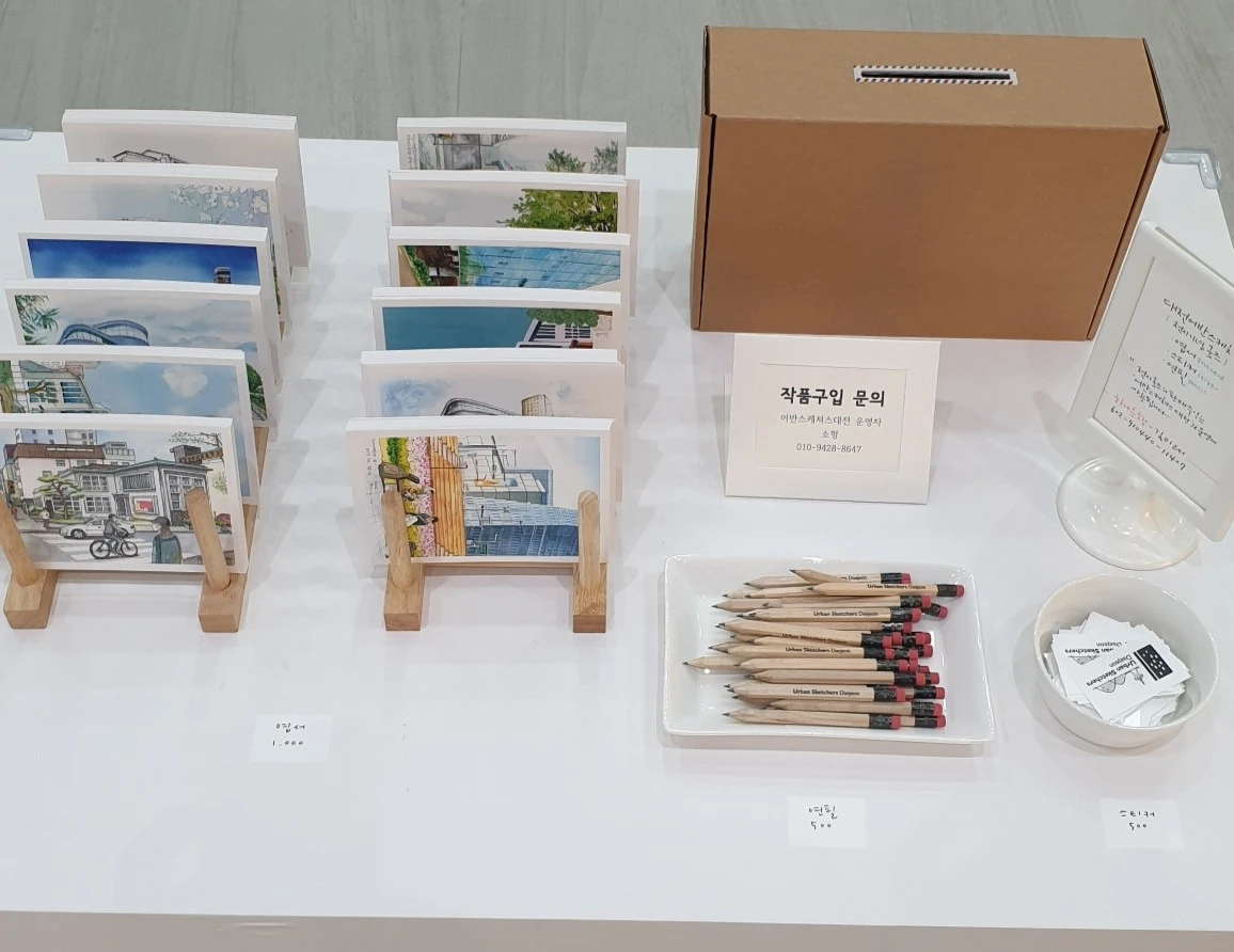 신세계 백화점에 철수하러 왔다. 2달의 길었던 어반 스케쳐스 대전 전시가 끝났다. 스태프들이랑 전시 회의하고 패널 페인트칠하고, 작품 걸고, 엽서 만들고, 전시 기념 워크숍 개최하고.. 많은 일들이 있었다.