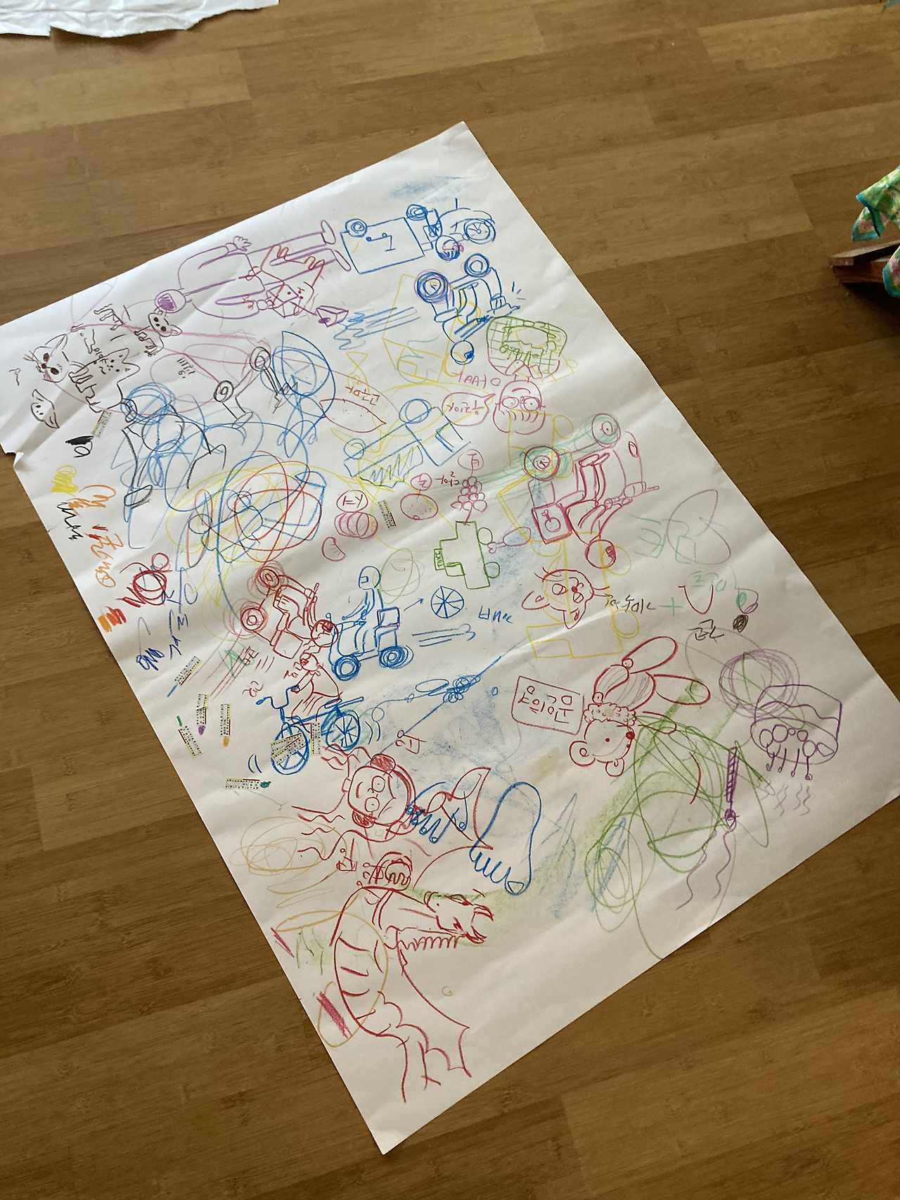 오토바이랑 헬멧 쓴 아저씨를 좋아해서 계속 반복해서 그려달라고 한다.