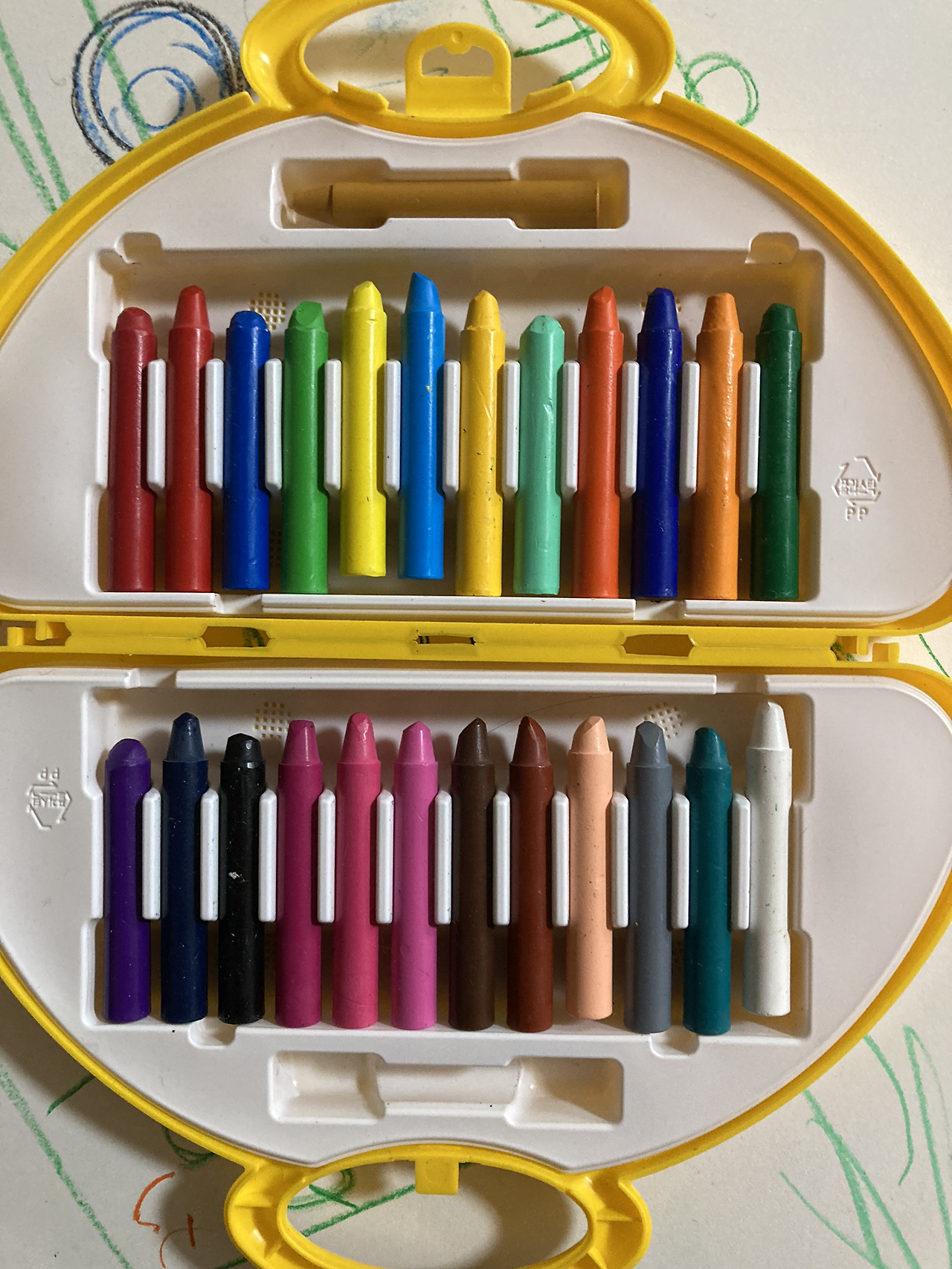 조카 크래용. 색이 이쁘도 생각보다 진하게 잘 나와서 나도 가지고 싶어 졌다. 크레욜라보다 더 진한 거 같기도… 민트색을 알려줬더니 아가가 민트색을 계속 써서 짧아졌다.