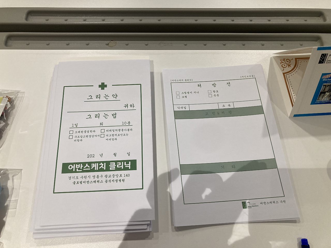 수원컨벤션 센터에 도착하니 다양한 행사와 코너들이 있었다. 오전에 강의가 두 개 상설로 스케치북 전시회, 켈리그라피 체험코너, 캐릭커쳐 그려주는 코너.. 신청해서 체험하는 미니 스케치북 만들기와 어린이용 그림책 만들기 수업도 있었다. 코너 중에 하나 내가 참가한 어반스케치 클리닉은 자신의 스케치북을 들고 와서 고민상담을 하고 조언도 듣고 처방을 받고 하는 코너다.
