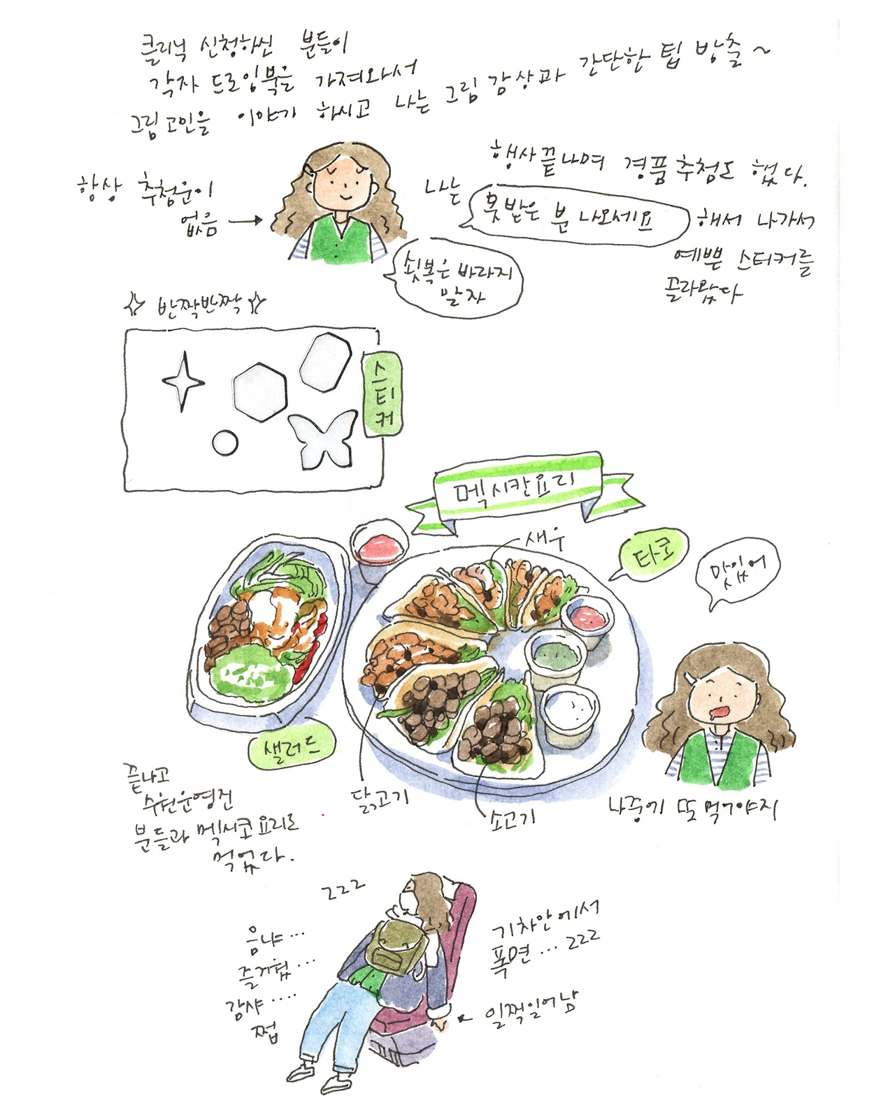 그림을 그리며 잘 안 되는 부분에 대해서 질문하시고 답 드리는 과정에서 스케치북을 많이 살펴볼 수 있었는데 일상의 소소한 순간들에 대한 성실한 기록이 가득했다. 어반스케치와 저널링이 새삼 모두에게 꼭 필요한 삶을 가꾸는 도구리는 생각이 들었다.