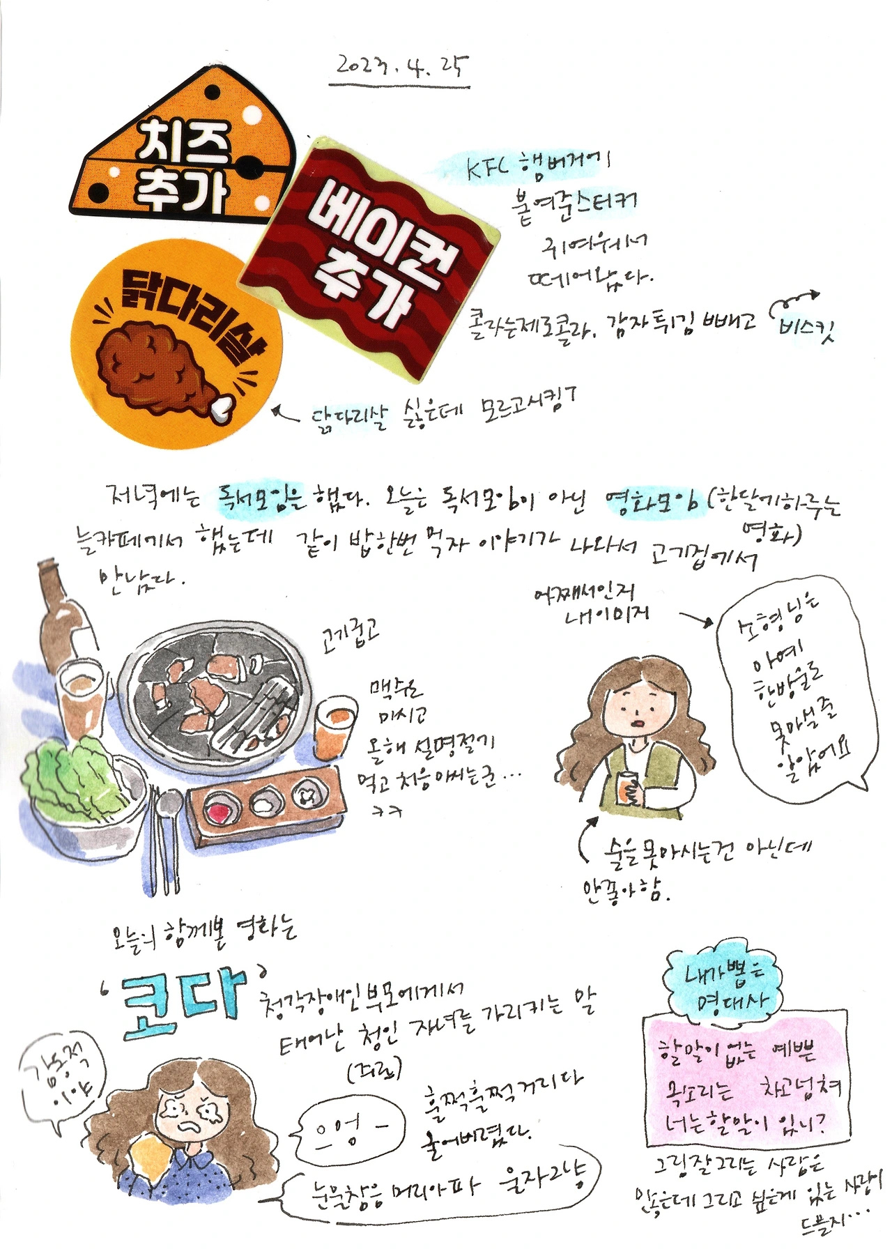 독서모임 매달 마지막 주에는 영화이야기를 하기로 했다. 참가자들이 돌아가며 영화를 정하고 각자 영화를 보고 와서 이야기를 나눈다. 영화를 정하는 기준은 넷플릭스에 있는 영화 ㅋㅋㅋ책은 같은 것을 읽기 부담스러워 각자 자유롭게 읽고 이야기 나누지만 영화는 같은 것을 보기 부담 없고 같은 주제로 이야기할 수 있어서 괜찮은 방법이다.
