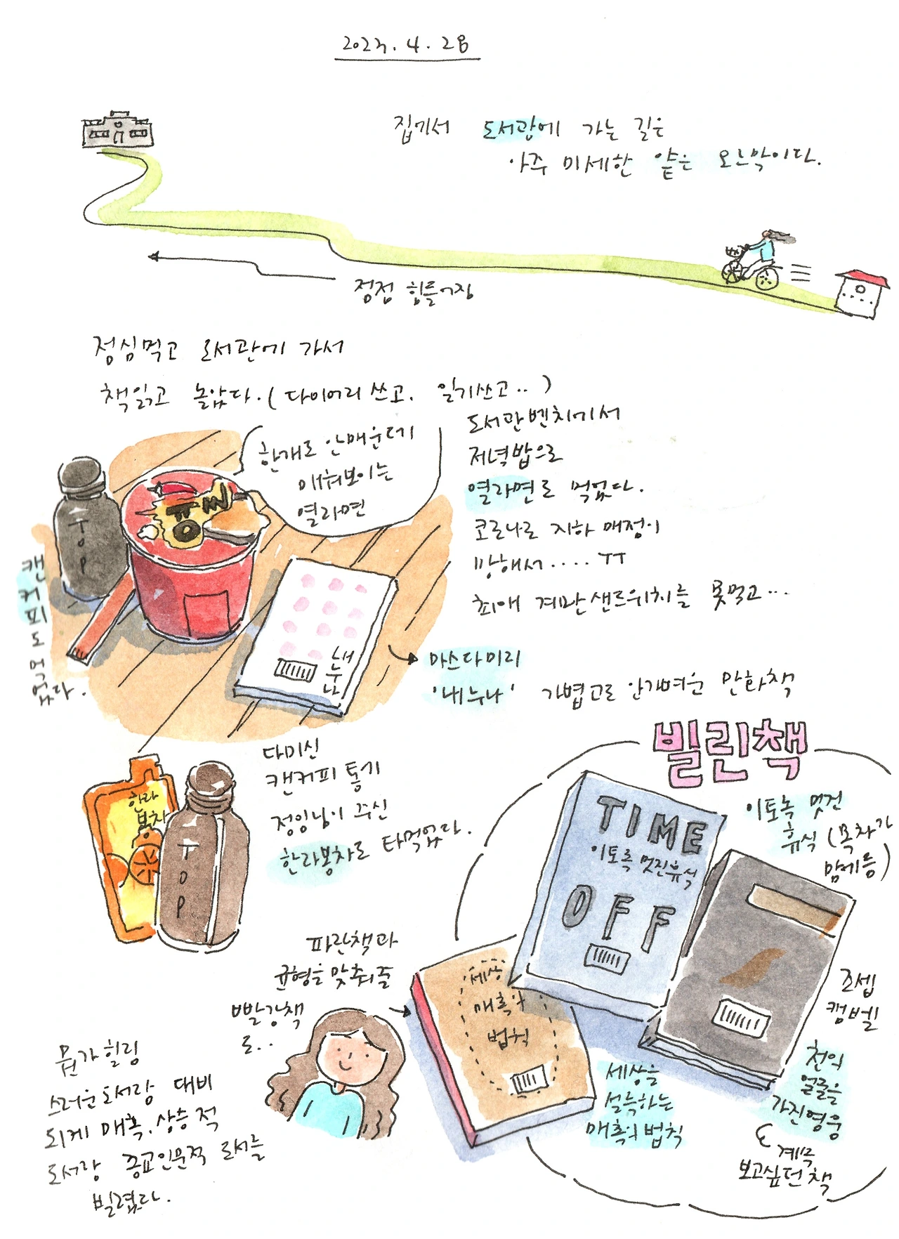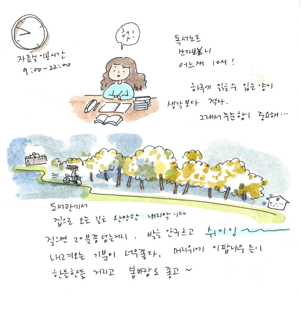 특히 이렇게 날씨 좋을 때나 여름에 더워서 집이 아닌 다른 곳 에어컨을 쐬고 싶을 때. 가까운 곳에 도서관이 있다는 건 정말 행운이다