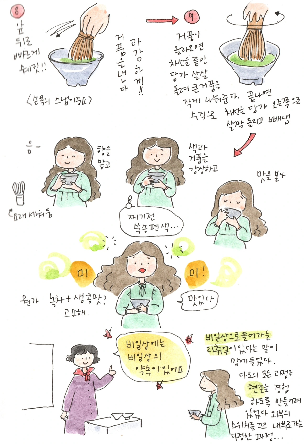 말차 타기는 모든 동작들에 룰이 있었다. 다완을 드는 법, 차선을 잡는 법, 말차 거품을 내는 법, 그릇을 닦는 법 등등. 모든 과정을 정확하게 하지 않아도 차의 맛에는 별 차이가 없겠지만 차를 마실 때의 상태는 다를 것이다. 모든 과정의 약속을 세세하게 지키려면 자신의 동작을 집중해서 관찰하게 되는데 그 과정을 거치며 잡념이 사라지고 차분해진다. 그렇게 차를 첫 모금 마실 때는 비일상의 마음 상태로 옮겨온다.