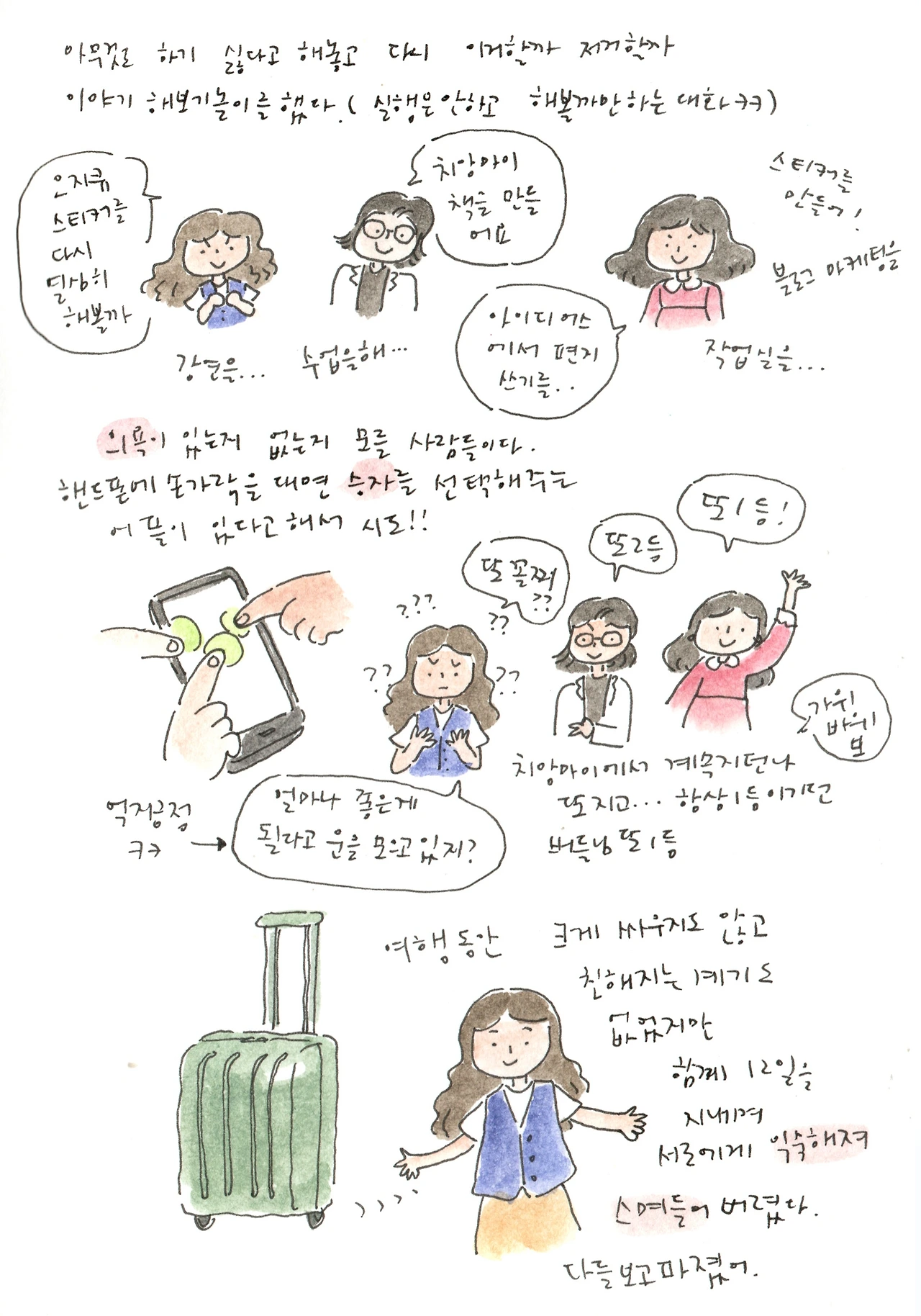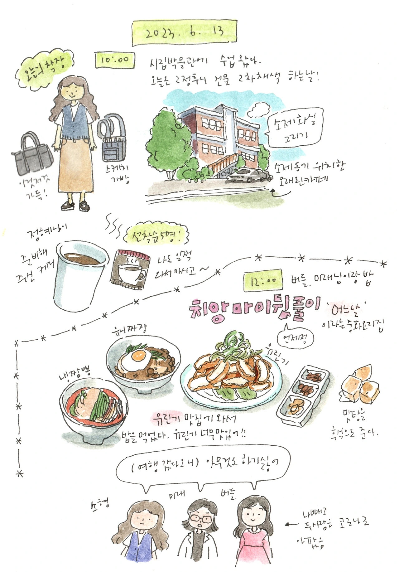 이제 일 년도 딱 반 지났다. 올 상반기에 어반스케치 수업이 4개였는데 5월, 6월에 끝나는 수업이 두 개 있어서 이제 수업 두 개뿐이다! 역시 여름은 여유롭구나! 했더니 바로 수업요청이 와서 두 팀 다시 시작된다. 비면 채워지고 비면 채워지는 감사한 사이클이다. 7월에는 대전어반스케치 전시가 있어서 전시 준비를 해야 하고 8월에는 내 전시가 있다. 9월쯤에 세종시립도서관에서 어반스케치 수업받으신 분들의 전시가 있고 10월에는 힐링아트 페스티벌에서 전시를 하게 될 거 같다. 전시준비만 계속하는 하반기가 될 거 같지만 틈틈이 그림 그리고 , 치앙마이 후기일기도 쓰고 책도 읽어야지..