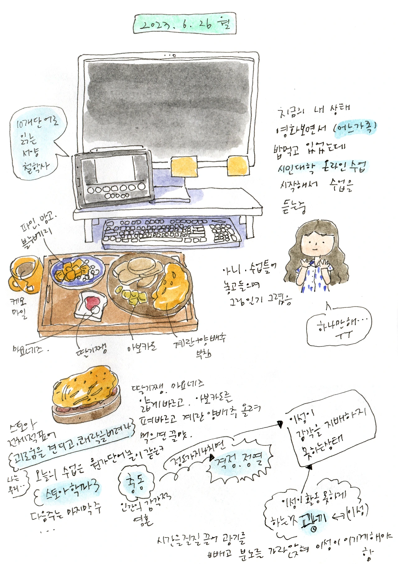 올해 시민대학 수업까지 듣겠다는 생각은 욕심이었나… 월요일수업인데 월요일마다 꼭 일이 생겼다. 아니 내가 일을 벌였다고 하는 게 맞겠다. 월요일마다 일을 벌였다. 매달 마지막 월요일은 그림일기모임, (카카오톡 오픈톡 독립된 주체들의 모임‘그림일기’) 매달 첫 번째 일요일은 언니랑 영화관 가기를 했다.