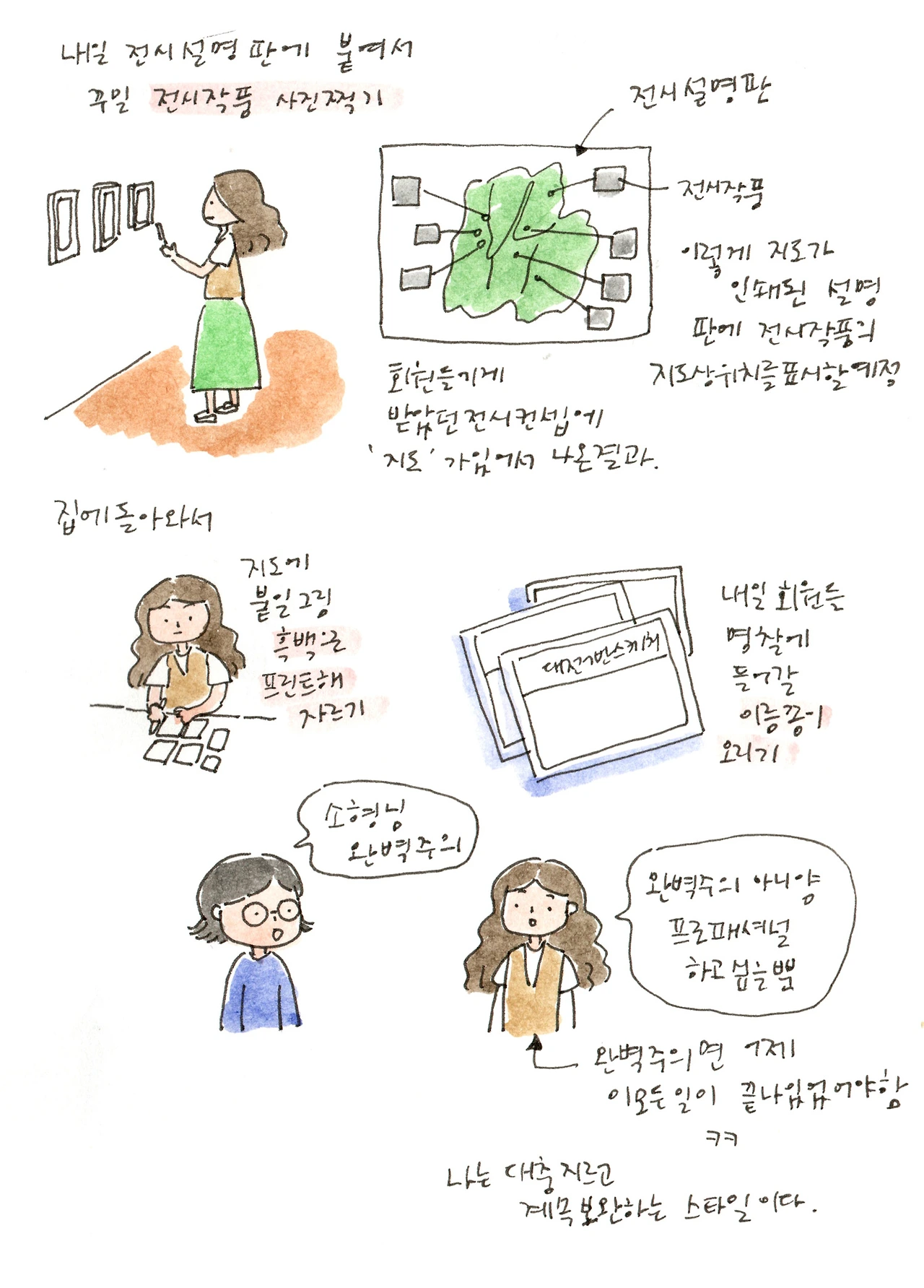 전시를 수작업으로 하면 개성 있고 다채롭긴 하다. 서류 써서 지원금을 받으면 이 모든 일들을 돈을 써서 할 수 있고 그럼 더 수월해질지도 모르는데 나는 왜 그러면 일이 더 많아질 거 같은 느낌이 들까. 그리고 서류 작업과 의뢰, 전화통화 등 내가 싫어하는 일들만 남을 거 같은 느낌이 들어서 자꾸 단체등록을 보류하게 된다. 좋아하는 일이 계속 좋아하는 일이었으면 하는데 책임과 부담이 커져간다.