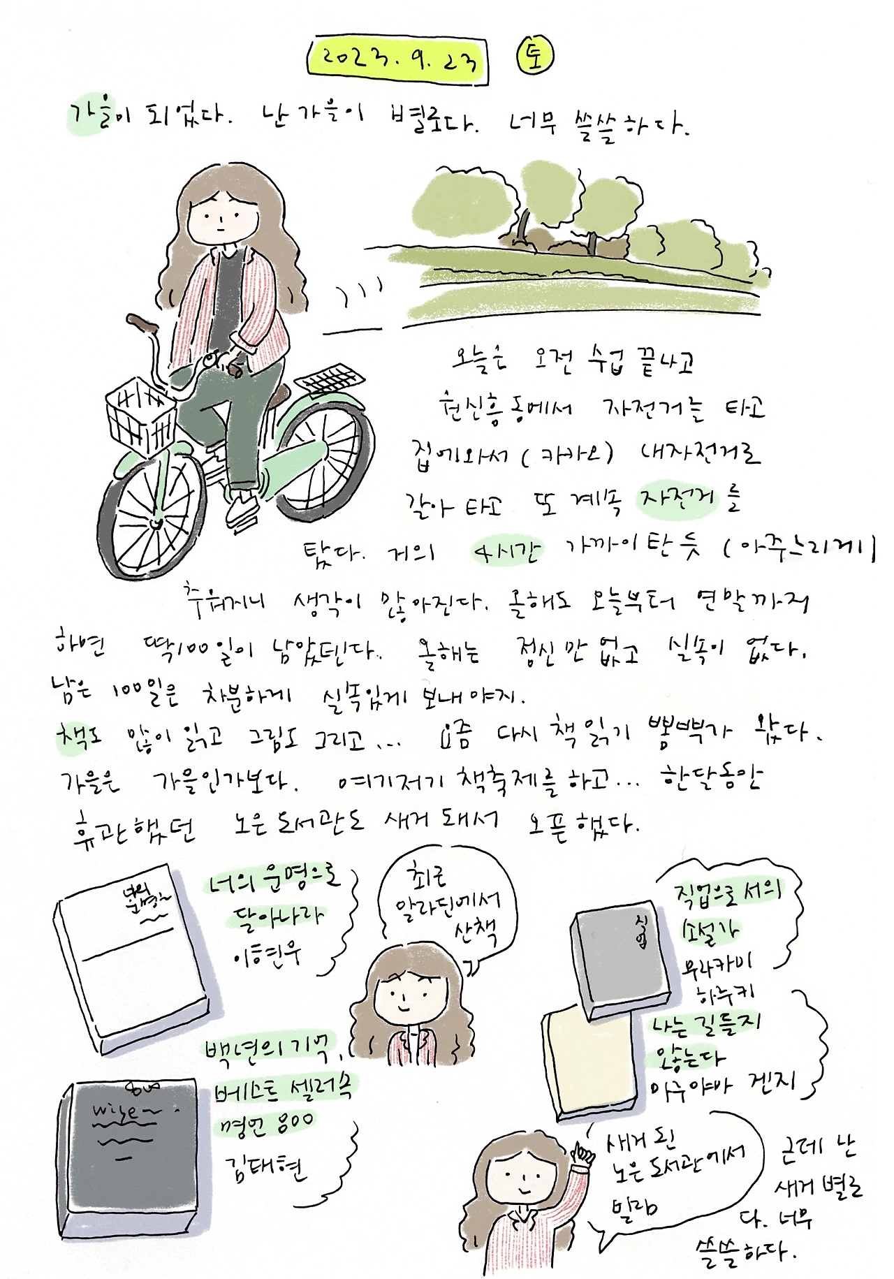 가을 타는지 요즘 바빴어서 그런지 생각이 몰려와서 자전거 타며 이런저런 생각을 했다. 혼자 울다가 웃다가 자기와 이야기를 나눈다. 사람은 누구나 죽을 때까지 나 자신이라는 친구가 있다. 나는 이 친구와 친하게 지내려고 종종 시간을 내곤 한다. 오늘도 이런저런 마음속 대화를 나눴다. 오늘 나눈 생각은 나는 계속해서 변화할 것이다. 하지만 누군가의 기대에 맞춰 변하는 일은 결코 없을 것이다.