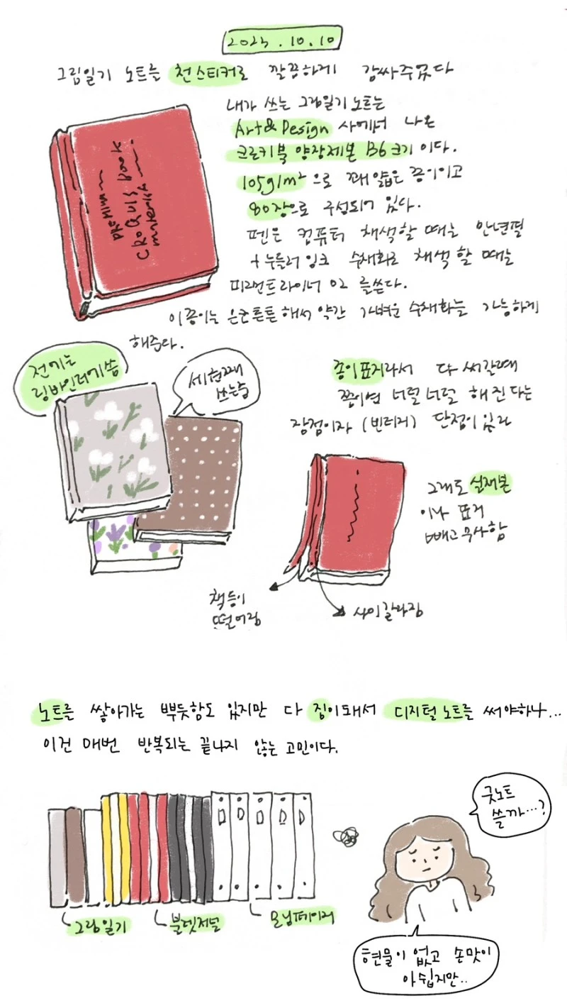디지털을 쓸 때는 아이패드에 굿 노트 앱으로 불렛님 저널이나 독서노트 등 글씨 노트를 쓰고 그림일기는 프로 크리에이트 앱에서 그린다. 장점은 수정이나 복제, 전송이 엄청 간편하다. 특히 전송이 빨라서 좋다. 종이에 쓰면 스캔하고 보정해서 디지털 파일로 만드는 번거로움이 있다. 그리고 출력했을 때 더 깔끔하게 잘 나온다. 단점은 휴대성과 즉흥성이 떨어진다. 바로바로 펴서 그리고 적기에는 역시 노트가 좋긴 하다. 노트에 손글씨만큼 빠른 메모는 없다. 핸드폰 메모도 느리다. 하지만 나에게 바로바로 펴서 적는 적극적인 메모 습관이 있냐 하면 그건 아니다. 하지만 그렇게 되고 싶기 때문에 간과할 수 없는 부분이다.