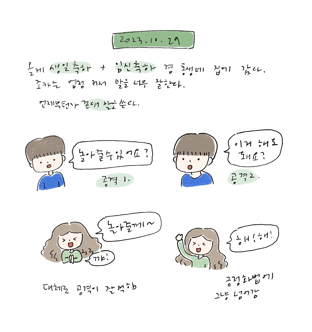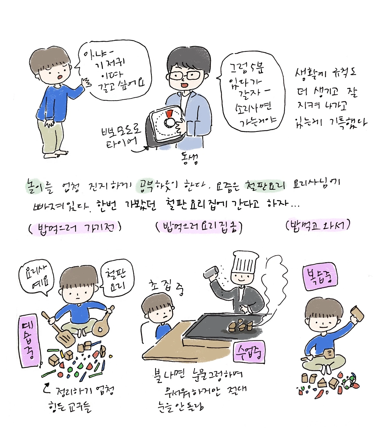 아가는 전에 외할머니 환갑 때 와보고 철판요리 셰프님에 반해 버렸는지 그 뒤로 계속 철판요릿집을 가자고 한다. 아가야 맛있는 랍스터 파는 철판요릿집 자주 가면 아빠 허리 랍스터 된단다. 가기 전에 오전부터 철판요리 시늉을 하며 놀다가 침대에서 뚜뚜 오토바이 놀이를 하다가 철판요리 도시락을 싸서 뚜뚜 오토바이를 타고 동물원 옆 풀밭에 돗자리 펴고 먹으러 간단다. 예전에 엄마아빠랑 돗자리 깔고 먹었던 기억이 놀이로 연결된다. 불이 나서 조금 무서웠던 철판요리도 부아앙 소리가 커서 무서웠던 오토바이도 오히려 놀이를 하며 친근하게 만들어 가는 모습이 신기하다. 눈이랑 눈썹이 처져서 무표정하면 시무룩해 보이는데 사실은 입 암! 다물고 엄청 집중하고 있는 상태이다. 그렇게 집중해서 보고 기억해서 놀이하며 재현을 한다. 아이들은 하루종일 엄청나게 많이 배우고 있다.