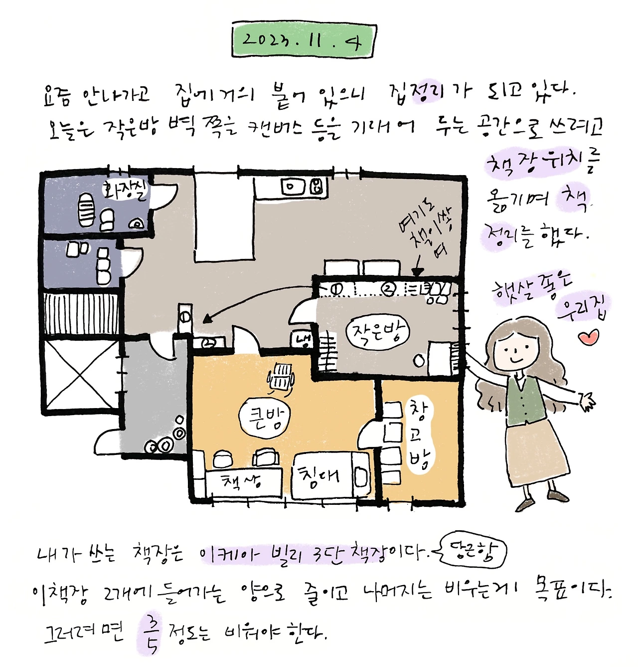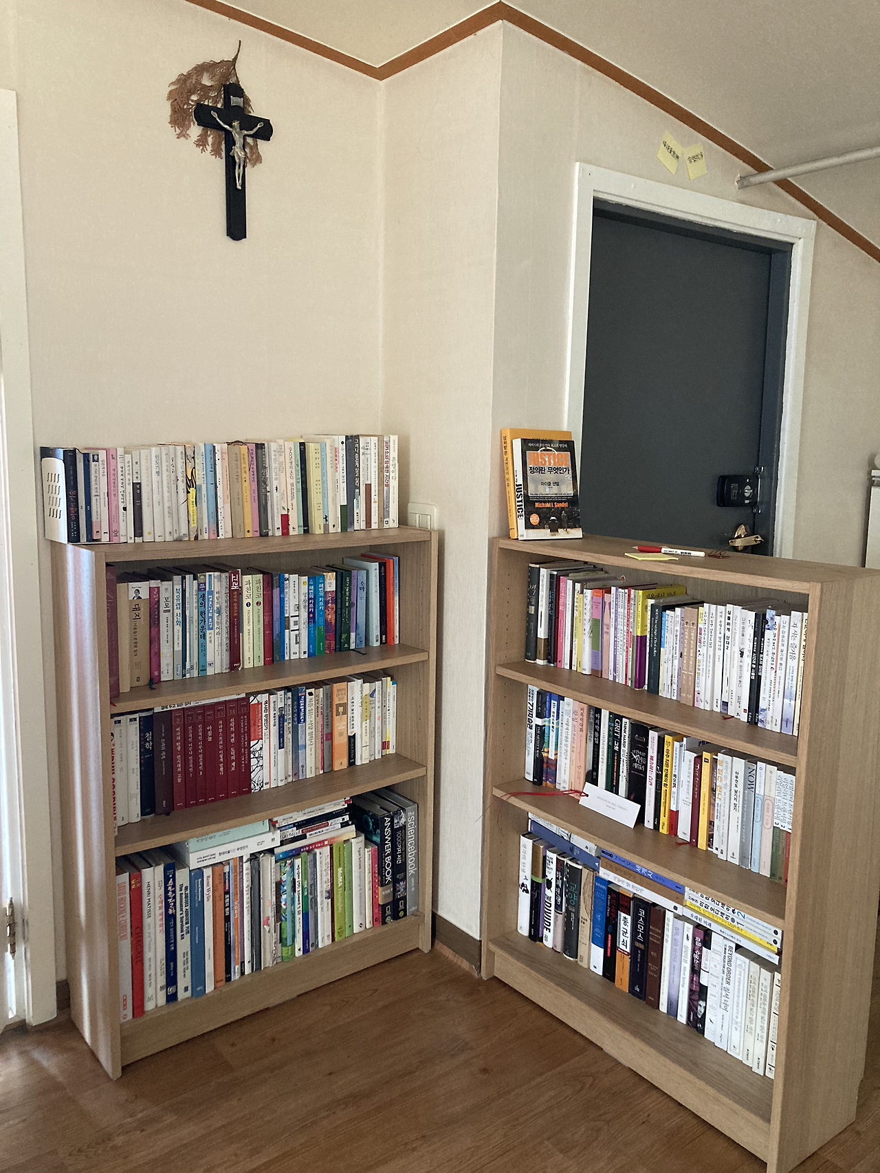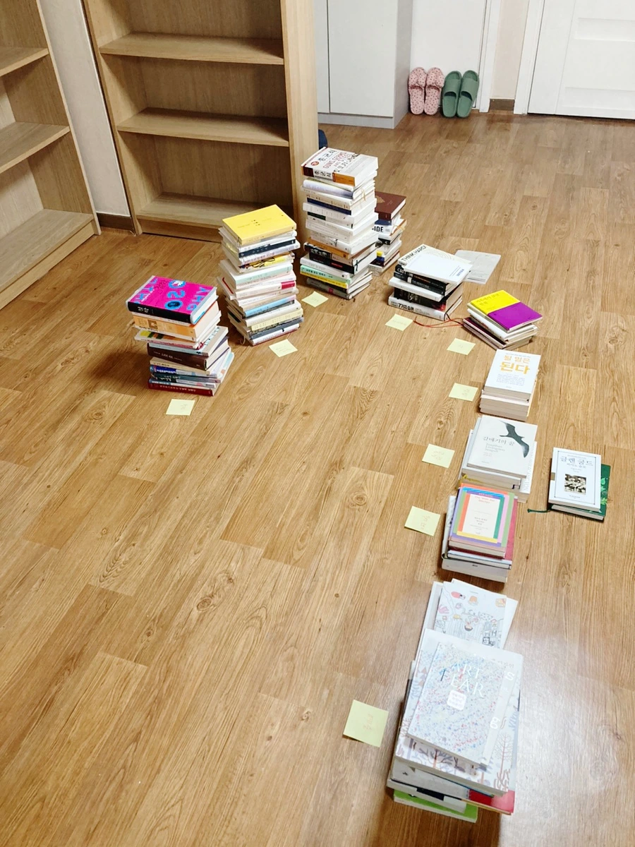 현관이 안에서 안 보이게 책장으로 막았다. 의외로 많이 답답해 보이지는 않았다. 불 켜는 스위치 아랫부분이 가려지는데 아랫줄은 센서등이라 안 쓰고 윗줄만 써서 다행이었다. 책을 전부 빼고 보니 책장이 살짝 휘어졌다. 그래도 빌리 책장이 꽤 튼튼한데도 무겁지 않은 괜찮은 책장이다. 당근에서 2만 원에 샀는데 새 거 같다. 작은방 벽에 3개가 딱 맞게 들어가서 하나를 더 구하는 중이었는데 그냥 두 개 안으로 줄여야겠다. 도서관이나 전자책이 있으니까..(사는 것만 못하지만) 읽은 책 중에서 다시 안 읽을 책을 비우고 안 읽었지만 빠르게 읽고 비울 에세이류는 따로 뒀다. 고전이나 계속 들춰 볼 책은 책장에 보관하기로 했다.