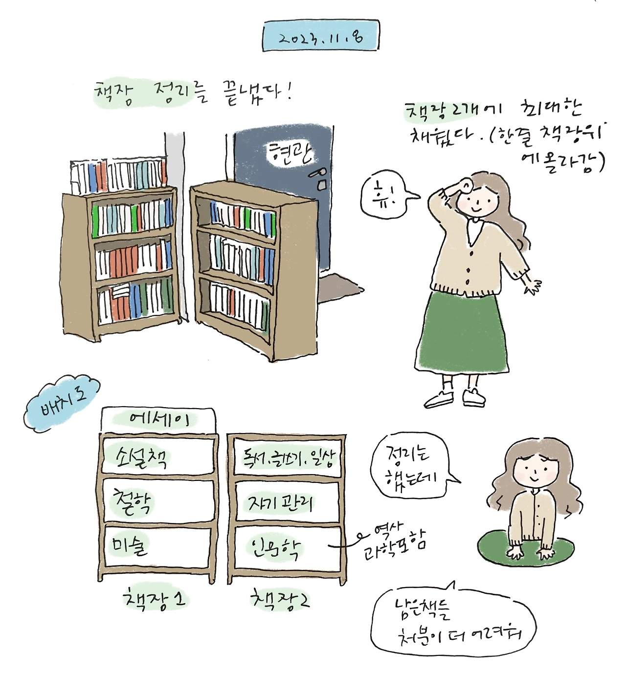 독서인이라고 할 정도로 많이 읽는 건 아닌데도 은근 책이 늘어난다. 다시 안 읽을 거 같은 책 빼고 좋아하는 책 위주로 남겼다. 에세이에서 좋아하는 책은 쓸만한 인간, 보통의 존재, 혼자 있는 시간의 힘, 클래식 감상수업, 정혜윤 작가님책 몇 권, 은둔기계, 무소유, 내방 여행하는 법.