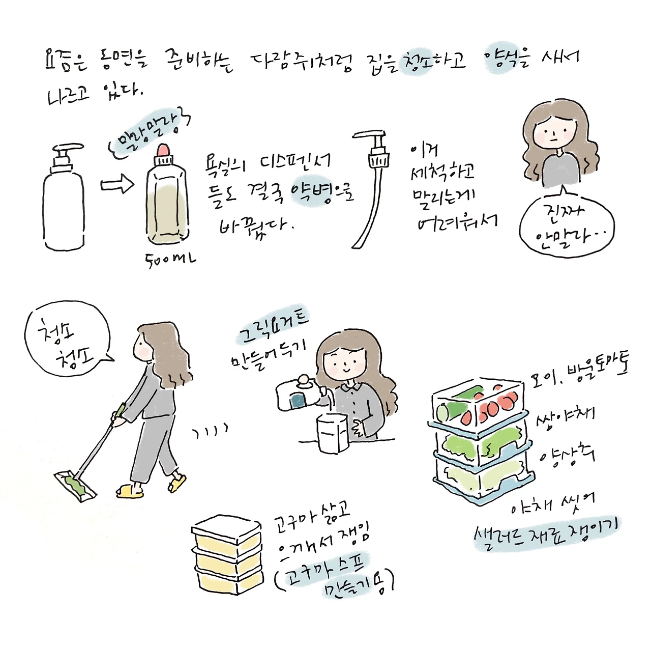 한동안 바쁘다고 무심했던 주변 물건들을 살펴주고 있다. 욕실 앞 규조토 발매트사포질해서 씻고 말려주고.. 오래된 욕실 샤워기도 교체했다. 매번 행주로 물기 닦느라 분주한 주방에 작은 스퀴즈도 걸어두었다.