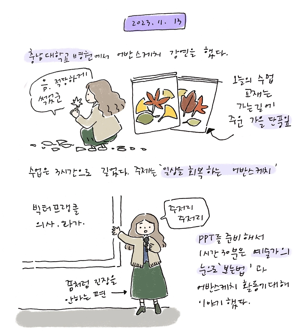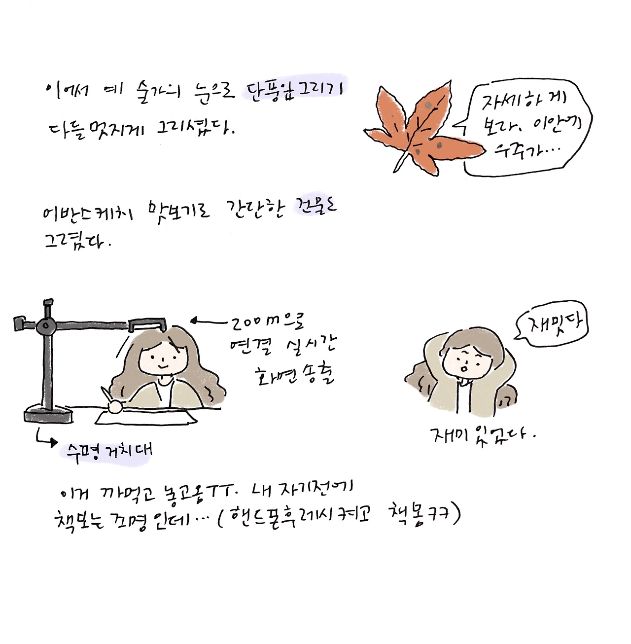 처음 세상을 보는 아이 같은 신선한 예술가의 눈으로 세상을 보는 방법에 대해 이야기하고 단풍잎을 아주 자세하게 관찰해 보며 그리기를 했는데 뜻깊었다.