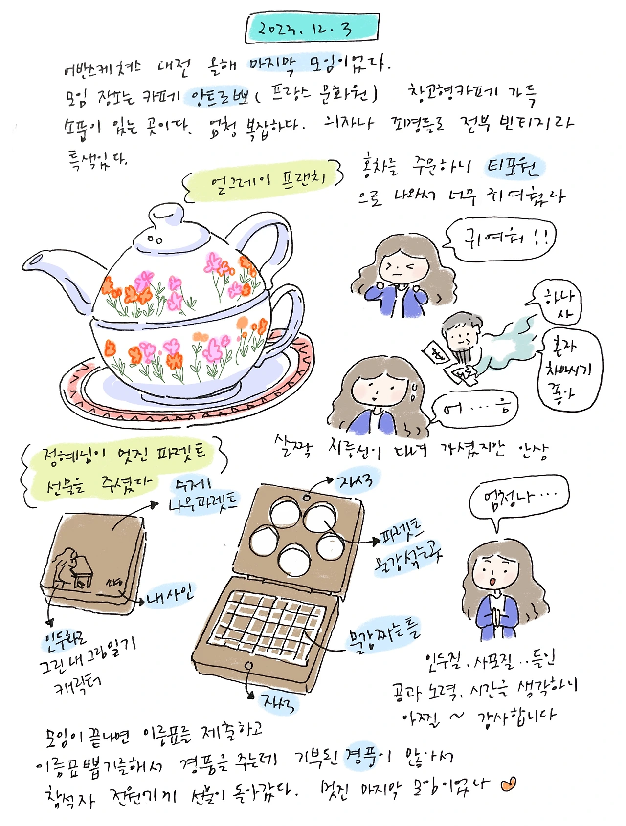 어반스케치 운영을 통해서 배운 것이 많지만 가장 크게 배운 것은 작은 실패들에 마음이 좀먹지 않는 법 아다. 회복탄력성이 높아진 거 같다. 호응이 있을지, 참여가 있을지 불확실한 상태에서 제안을 계속해서 하다 보면 마음근력이 길러진다.