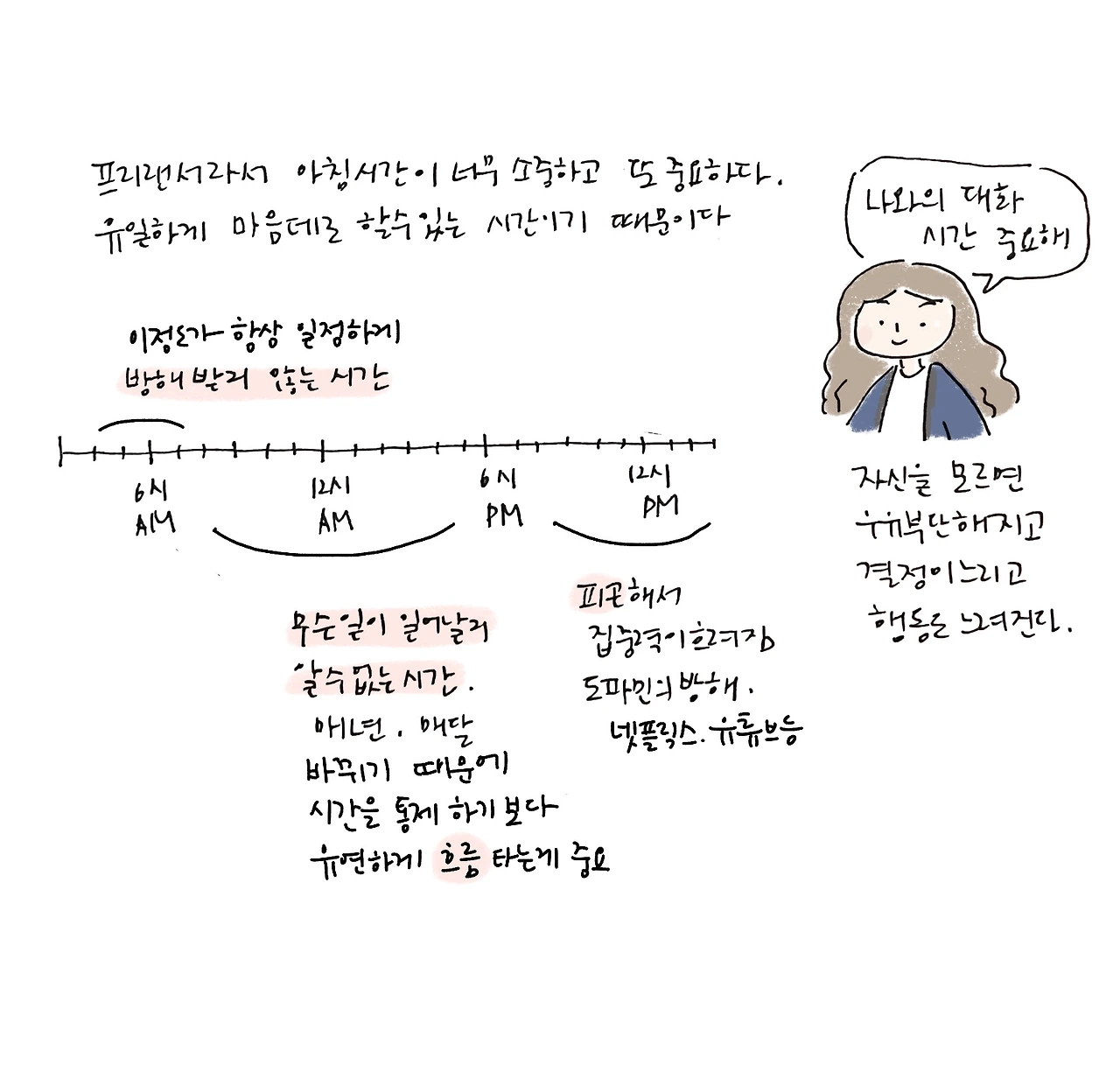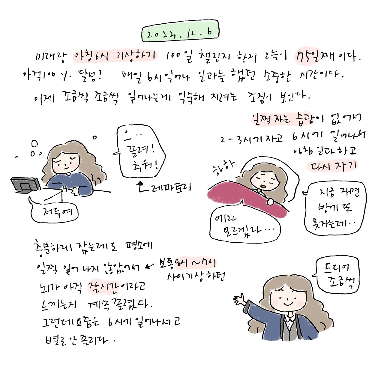 미라클 모닝이나 챌린지 열풍을 보며 뭘 그리 애쓰며 사냐고 하는 사람들도 있겠지만 애쓰며 힘들게 자신을 괴롭히는 것이 아니라. 호기심과 애정을 가지고 자신이라는 영토를 탐험한다고 생각한다. 나를 알고 싶고 발견하고 싶으니까.