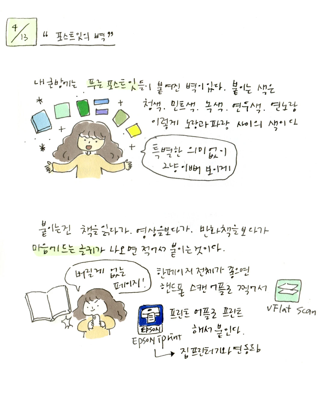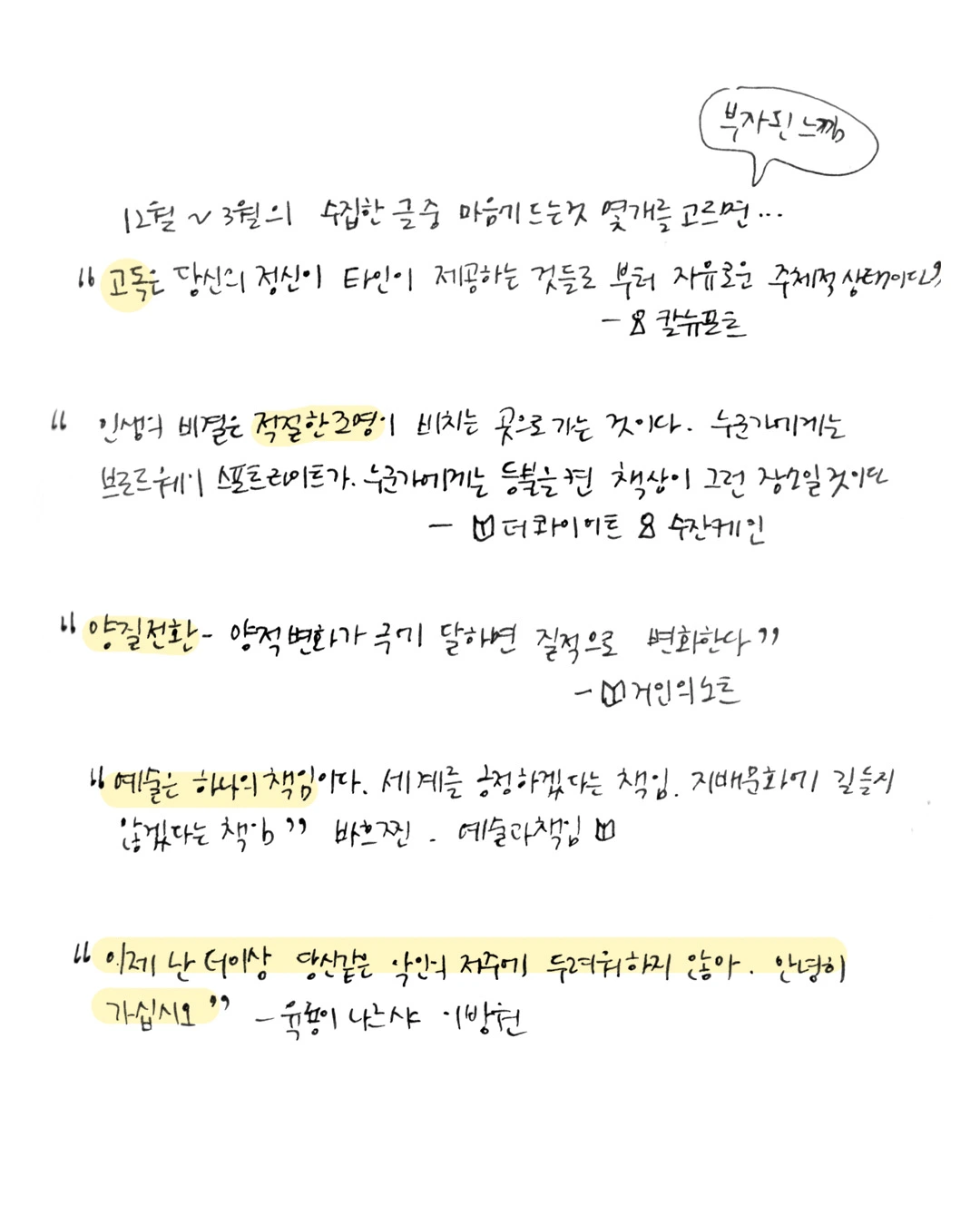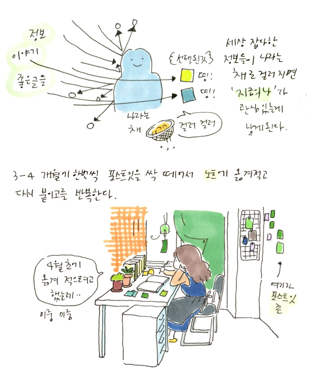 짧은 콘텐츠의 홍수 속에서 살아가며 프리랜서로 짧은 프로젝트를 하다 보면 나라는 사람이 어떤 생각의 흐름 속에서 살아가는지 모르기 쉽고 또 생각이 어떤 식의 행동으로 발현되는지 인과성을 인식하기 힘들 때가 있다. 그래서 하나의 일을 하면 (의뢰받은 일이든 스스로 벌린 프로젝트든) 이 일을 하게 된 계기나 소개해 준 사람을 기준으로 전부 일 연결 맵을 그려준다. 사람 이름이나 프로젝트 명을 적고 화살표로 연결하는 것이다. 처음의 출발은 내 블로그나 대전 어반 스케치 활동으로 시작해서 지금은 굉장히 복잡해 보이는 맵이 되었다. 매일 한 문장씩 쓰는 생각문장도, 아침에 쓰는 일기도, 콘텐츠와 책에서 발췌한 공감이 갔던 문장들도 매달 다이어리 리뷰를 하며 따로 옮겨 적어둔다. 그게 무슨 도움이 되고 있는지는 아직 잘 모르겠지만 당장 성과나 실력의 향상이 눈에 보이지 않아도 필요하다고 생각하는 것들을 꾸준히 해나가는 게 중요하다고 생각한다. 생각하고 끄적이고 하는 것들이 가치관이나 자아를 강화시켜 주기 때문에 잔잔한 바다에서는 느려 보여도 풍랑이 치는 시기에도 여전히 전진을 지속하게 하는 힘이라고 생각한다.