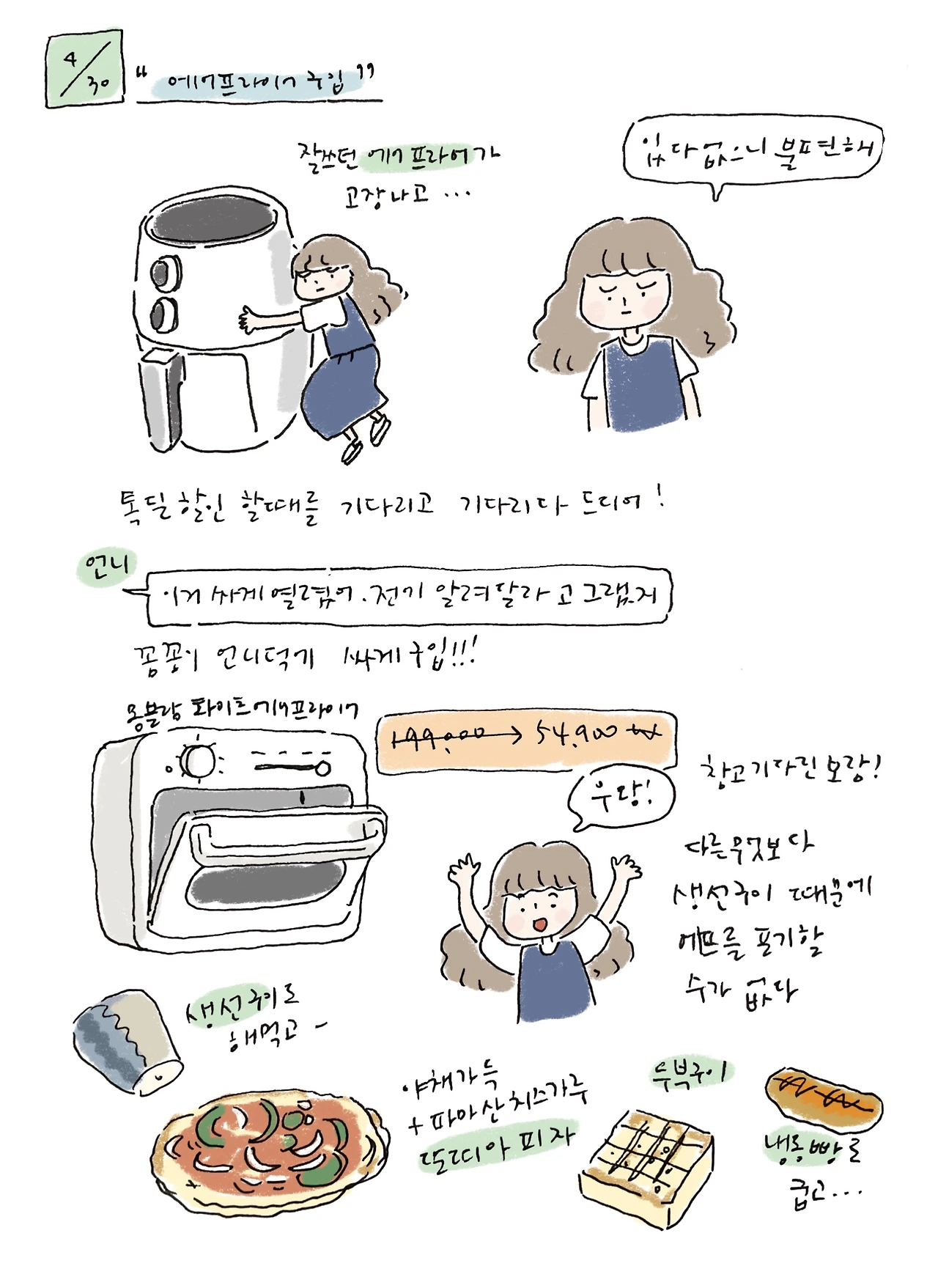 동글동글해서 너무 귀엽다. 바케스형이 아니라서 설거지를 못하고 매번 내부를 닦아야 하는데 관리를 잘할 것인가… 처음 사면 최대 온도로 15분 정도 예열해서 그을림 방지 오일을 날려줘야 한다고 설명서에 쓰여있었다. 연기와 냄새가 날 수 있다고 했는데 가열하다 보니 역시 연기가 폴폴 올라왔다. 어느새 집안 가득 뿌여스럼 해져서 창문 열고 환기시켰다. 주말에 온 비로 공기가 좋아서 다행이었다. 맛있는 거 해 먹어야지.
