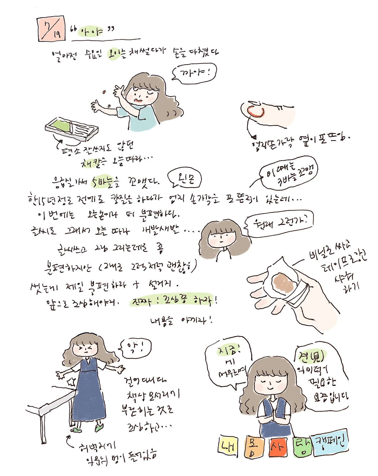 살색 밴드가 아파 보여서 스마일 밴드를 감아줬다.