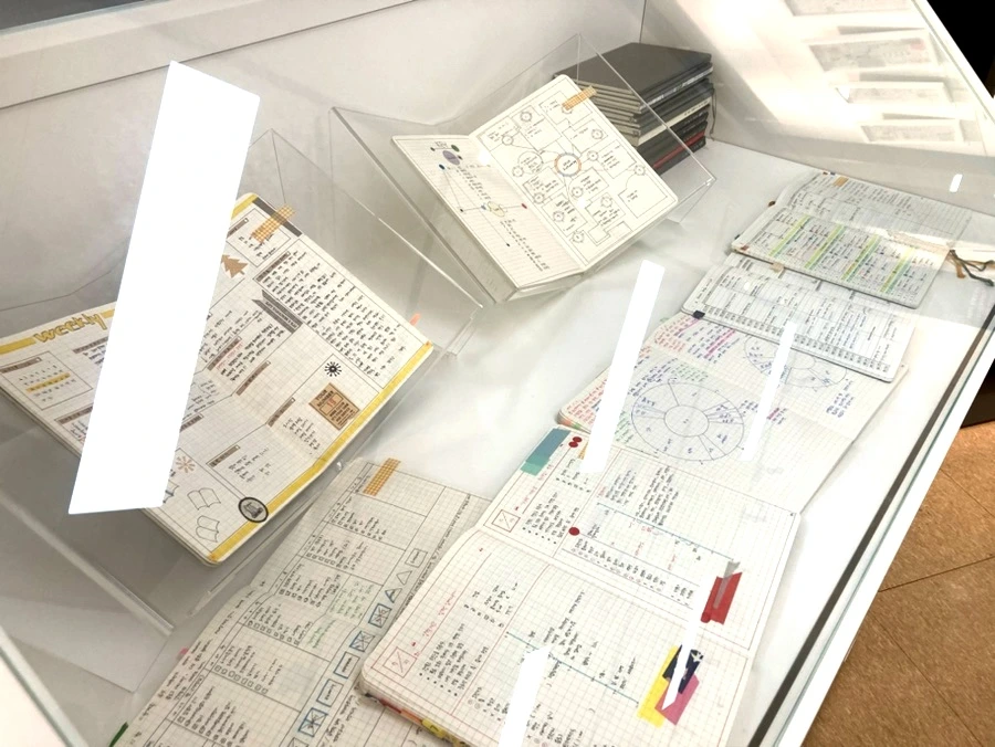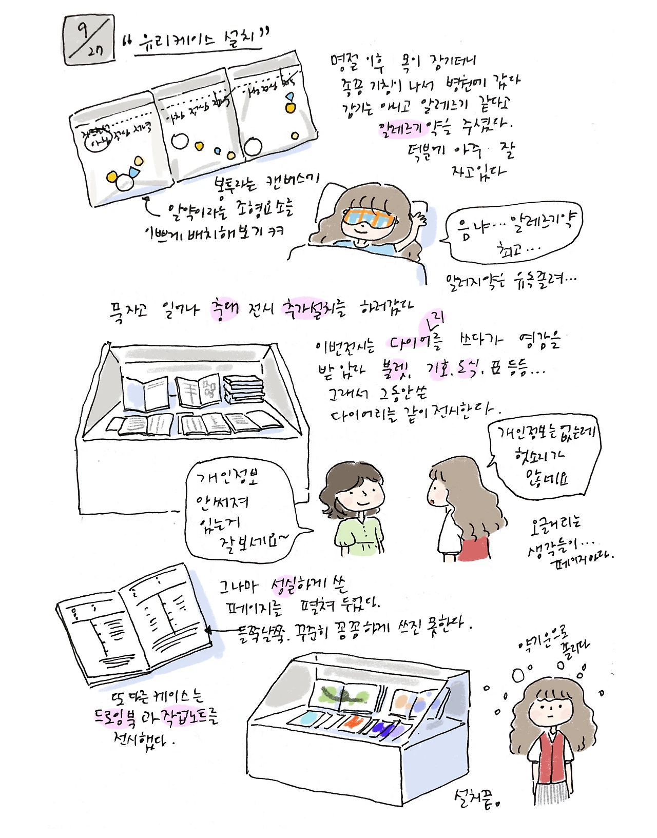 이번 그림들의 바탕이자 계기가 된 다이어리 쓰기 매일 기록을 반복하면서도 성장을 추구하는 점이 전시 주제랑 같다.