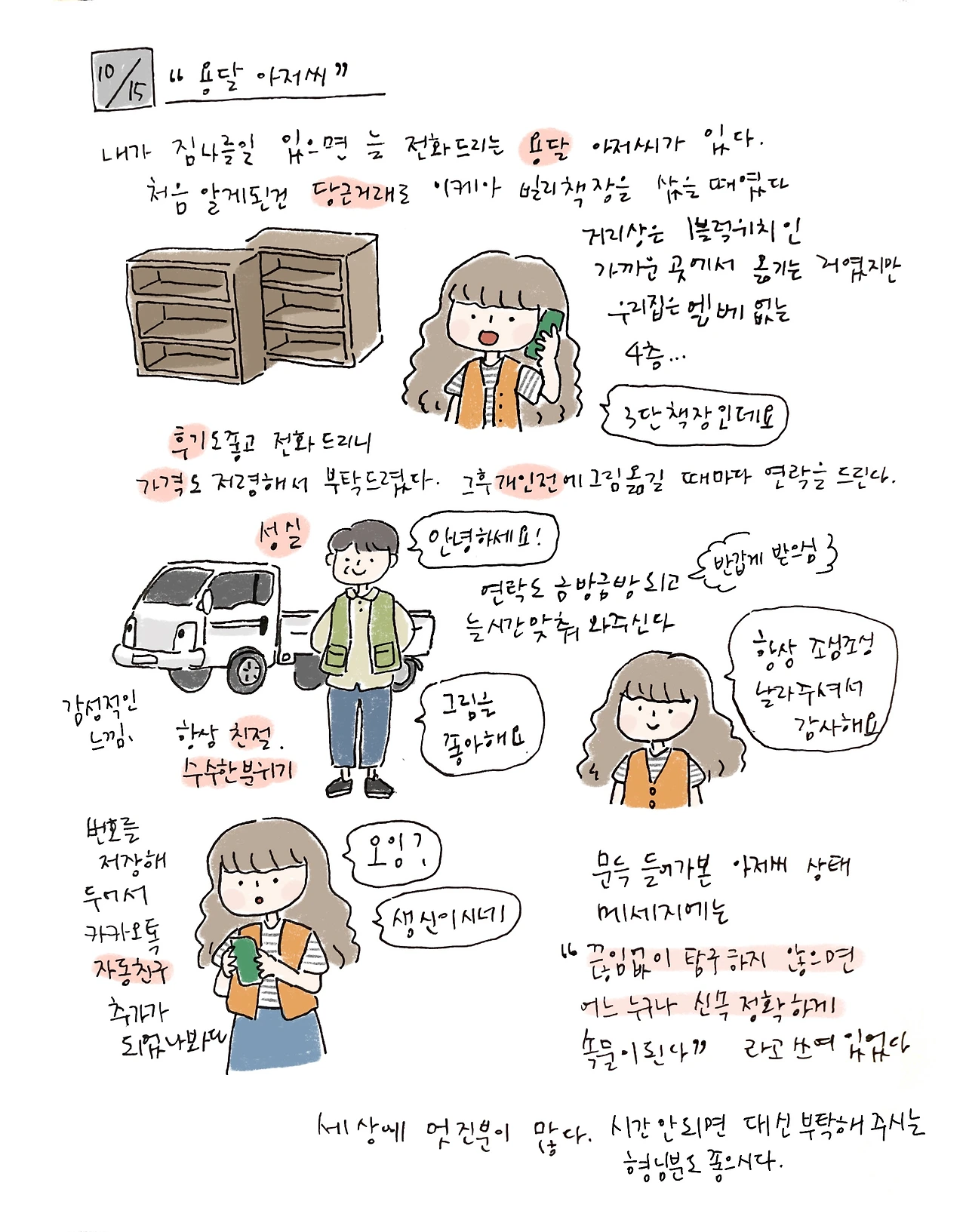 남들 다 그렇게 사니까, 요즘은 이게 대세니까, 세상이 그렇게 만드니까, 하며 자기의 주인자리를 내주는 언어들이 난무하지만 삶이 잘못된 방향으로 가지 않도록, 자신이 부끄러운 사람이 되지 않도록 성찰하며 사는 분들도 참 많다. 용달아저씨는 물건을 날라다 주실 때는 신속 정확하시지만 마음밭을 농부처럼 손수 일구며 매해 비옥해져 가는 땅을 만들고 계신 거 같다.