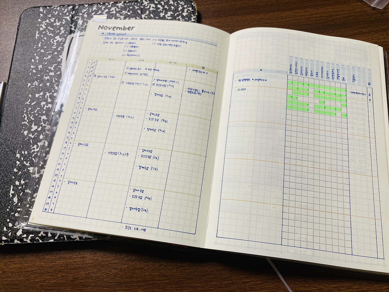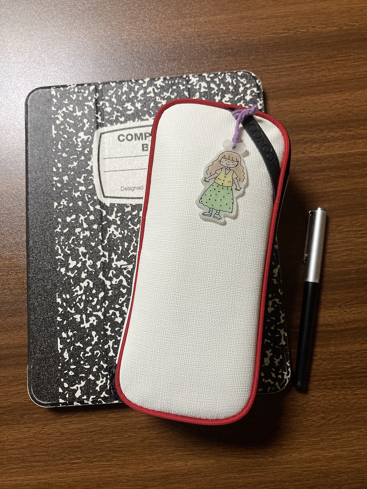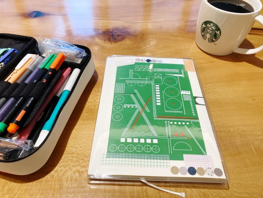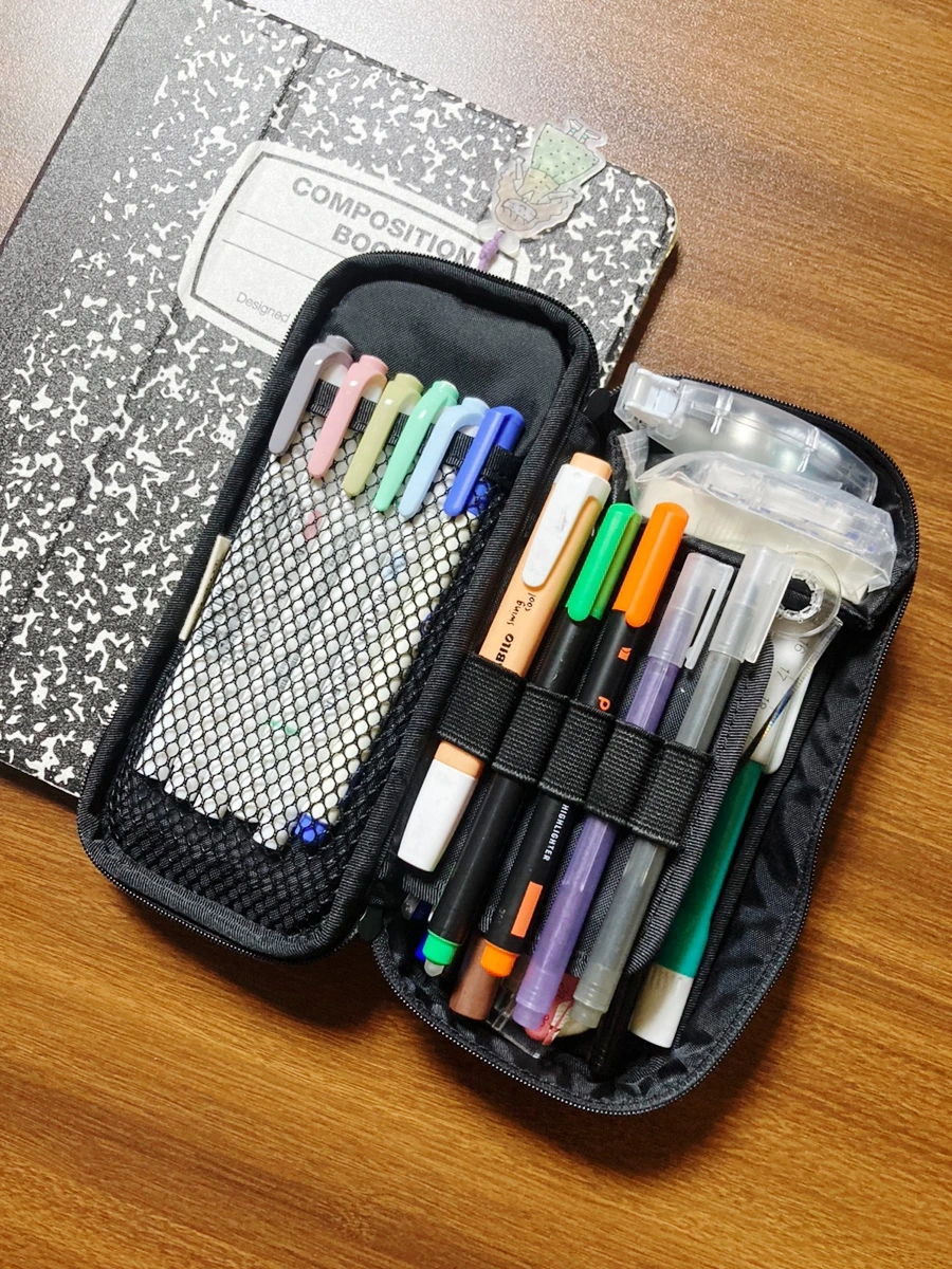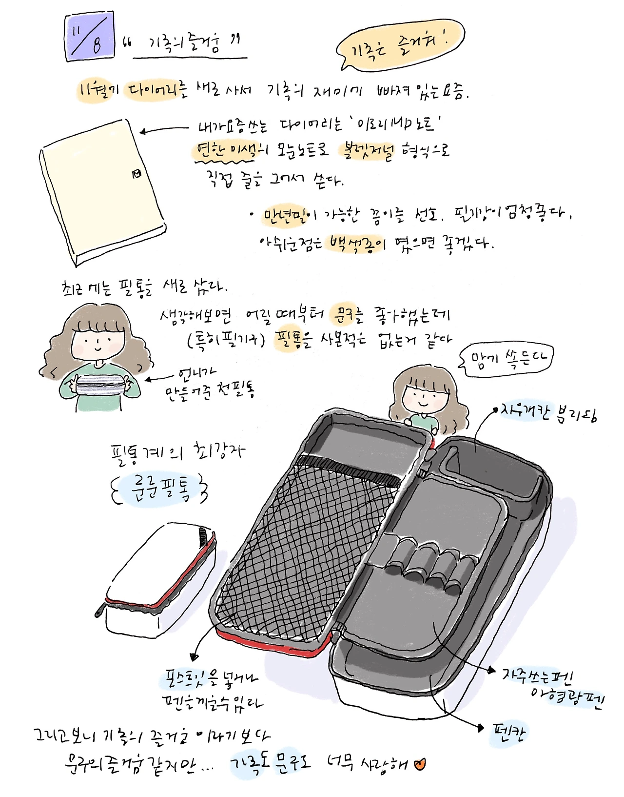 아이패드 케이스는 컨포지션 노트 케이스. 실리콘이 아니라 때가 안 타서 엄청 만족하며 쓰고 있다. 형광펜 가득. 올해 그린 매일 이미 페이지 그림들을 형광펜으로 많이 그려서 형광펜이 많아졌다.