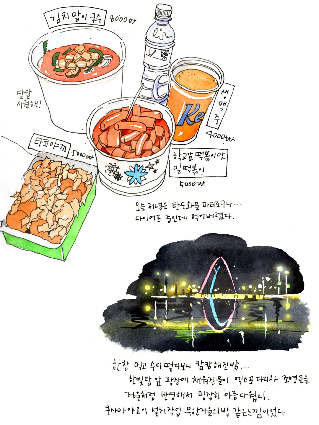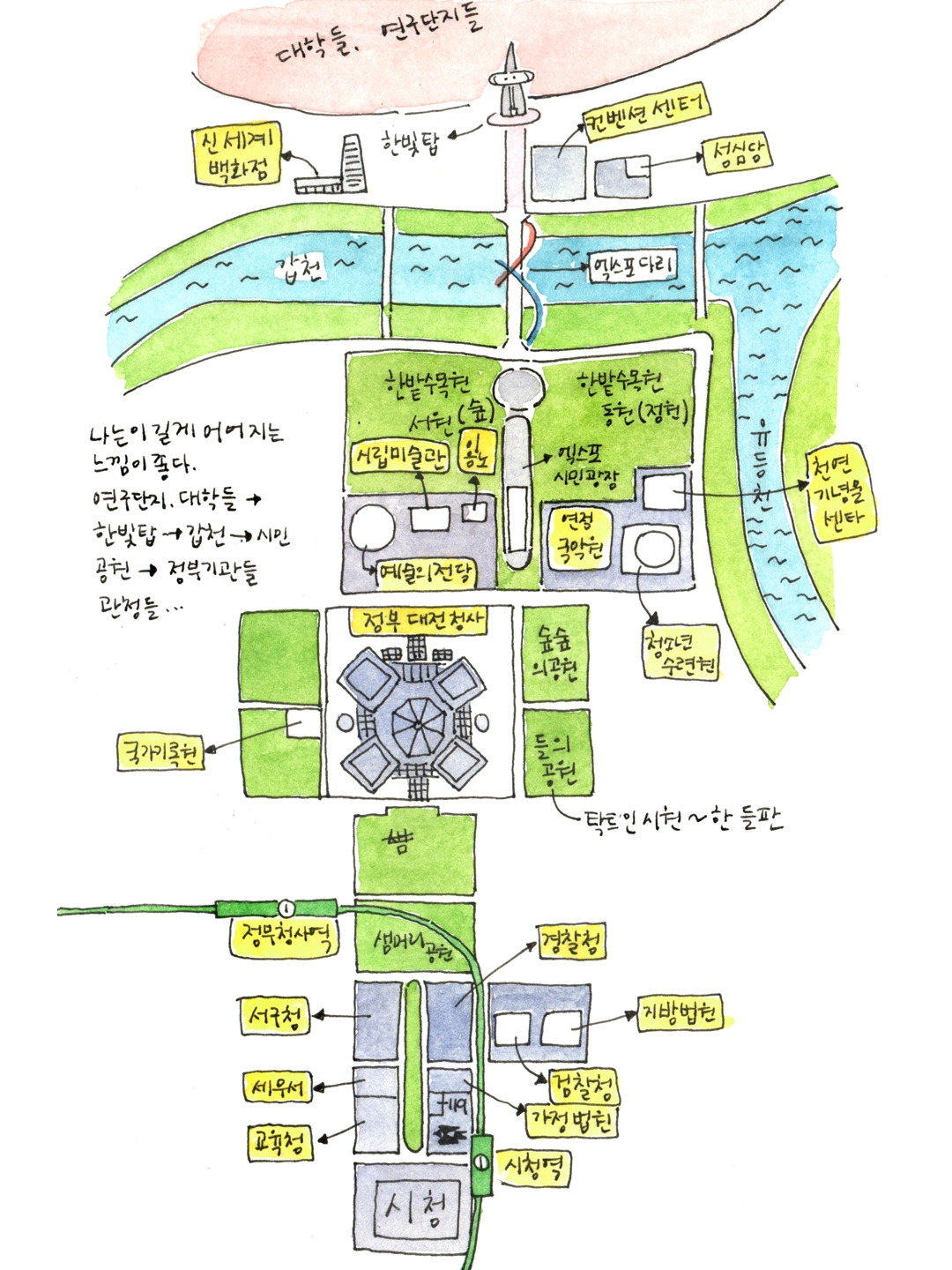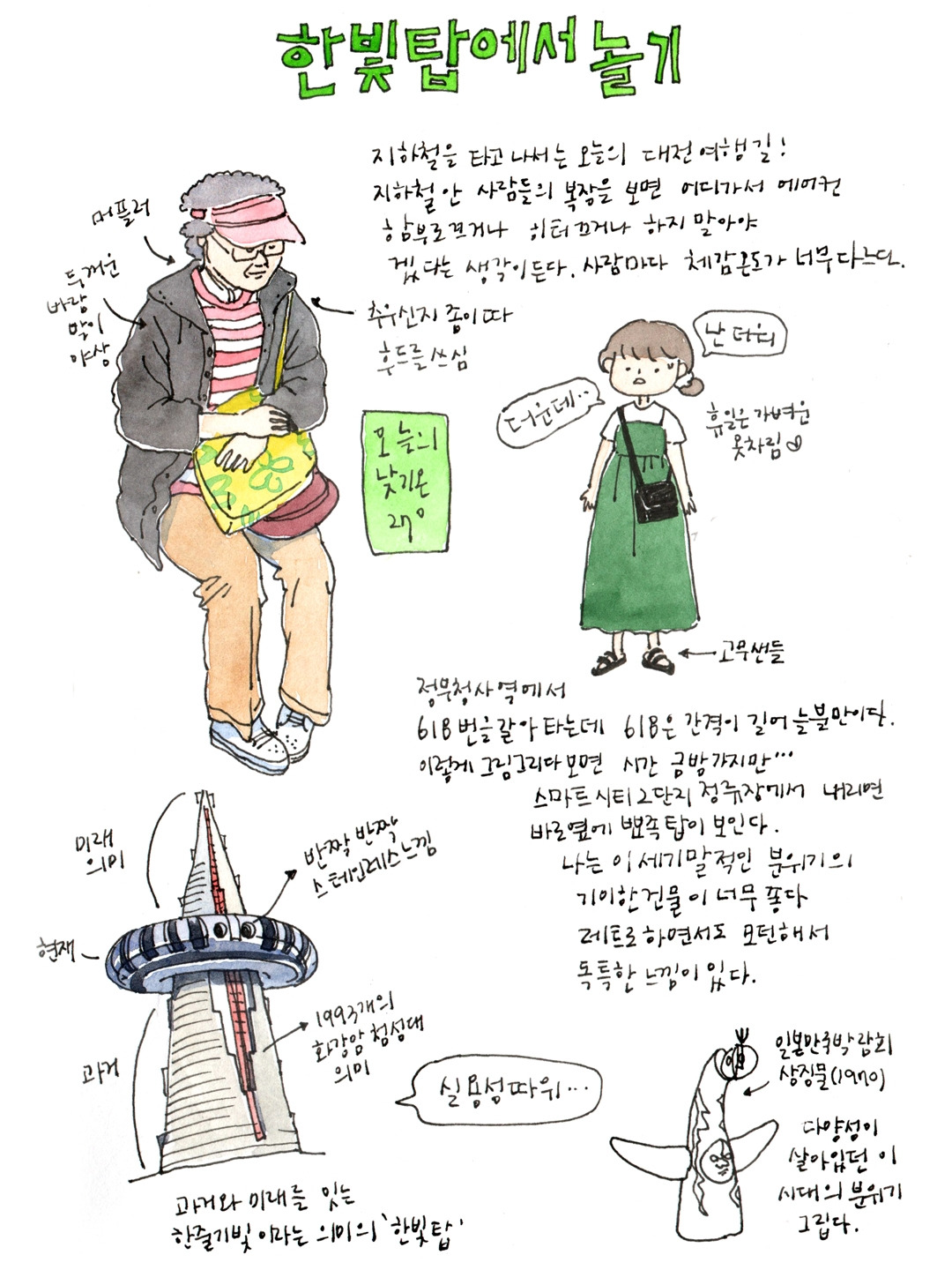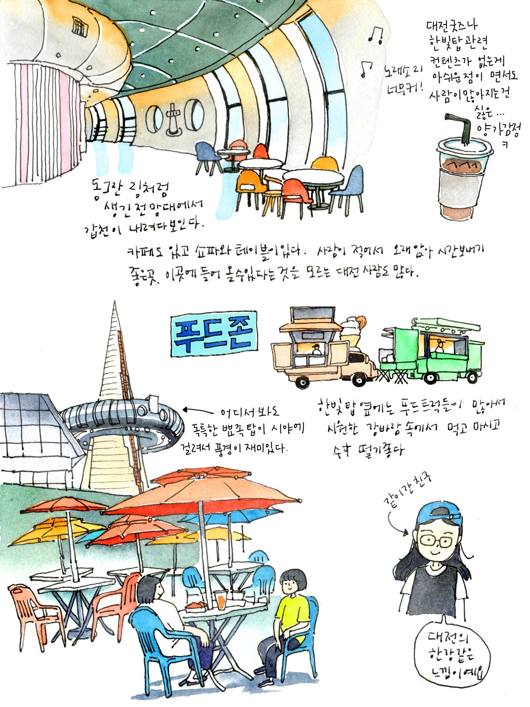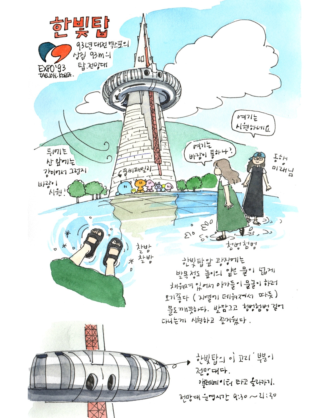 한빛탑은 대전 사람이라면 여름 저녁에 놀러 가기 참 좋은 장소이다. 슬리퍼 신고 가서 광장 앞에 채워진 물에 발 담그고 걷다가 전망대에 올라가 갑천 풍경과 석양을 보고 푸드코트에서 시원한 바람과 맛있는 음식을 즐기며 좋아하는 사람들과 수다 떨다 보면 행복이 별건가 하는 생각이 든다. 대전지역에 살지 않는 사람들, 대전에서 1박2일 정도 하는 사람들에게도 정말 추천하는 곳이다. 특히 자연을 즐기고 편안하게 힐링할 수 있는 장소들이 가깝게 배치되어 있다. 호텔에서 나와 한빛탑을 즐기고 근처 컨벤션 센터에 있는 성심당에서 빵도 먹고 갑천 수상스포츠 체험장에서 수상 스포츠를 즐겨도 좋고 자전거를 빌려 갑천 라이딩을 해도 좋다. 그리고 엑스포 다리를 건너 한밭 수목원에서 산책하고 시립미술관이나 이응노 미술관에서 전시를 보면 빠르고 복잡한 것들로 가득했던 머릿속을 탁 트인 하늘과 자연으로 정화할 수 있다.