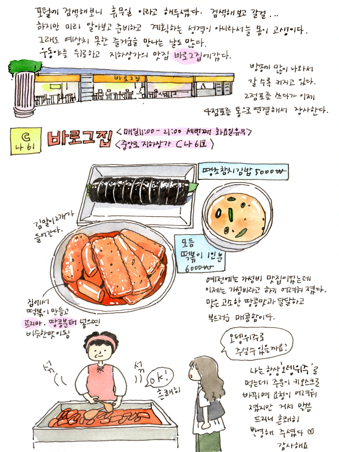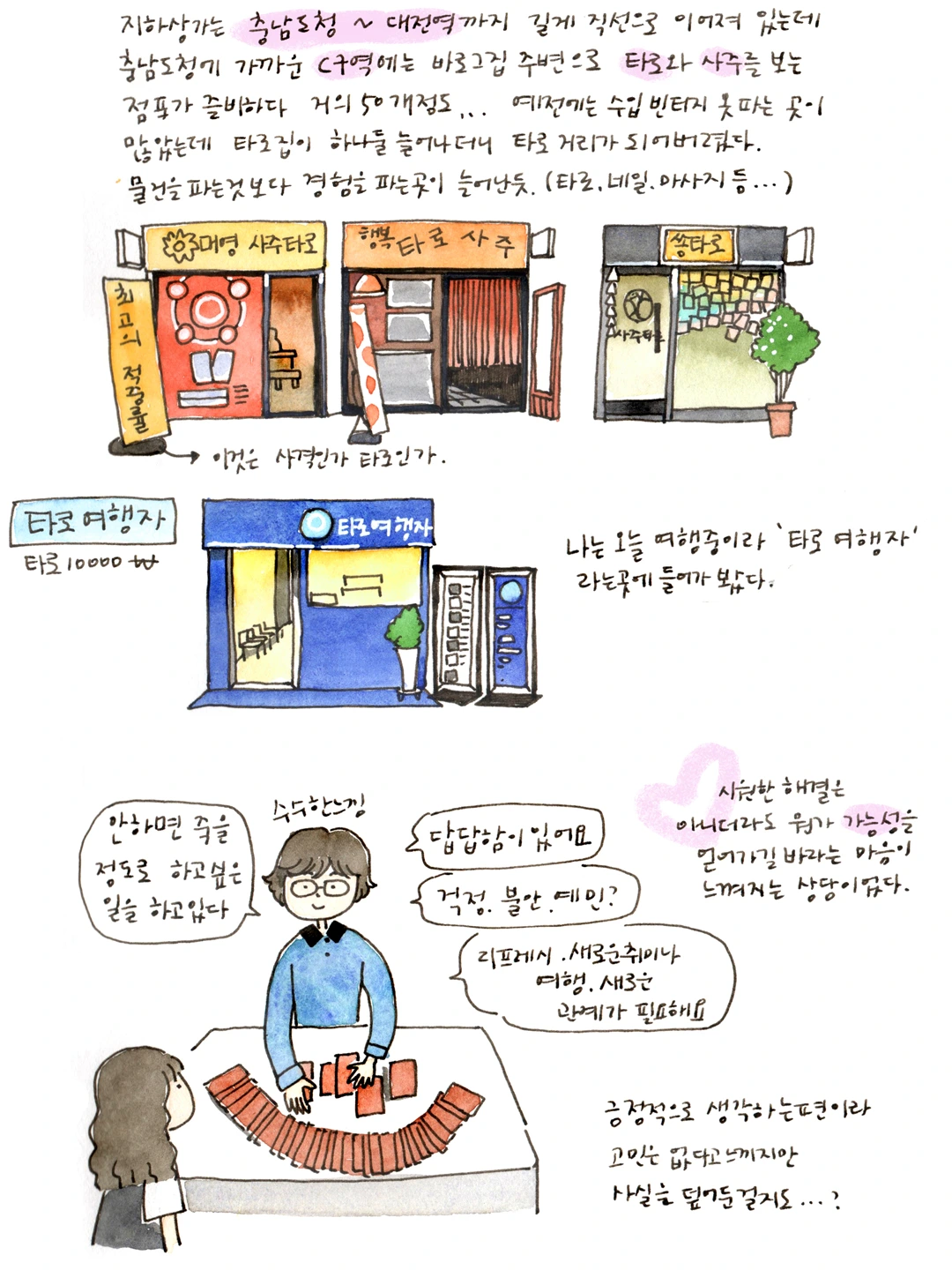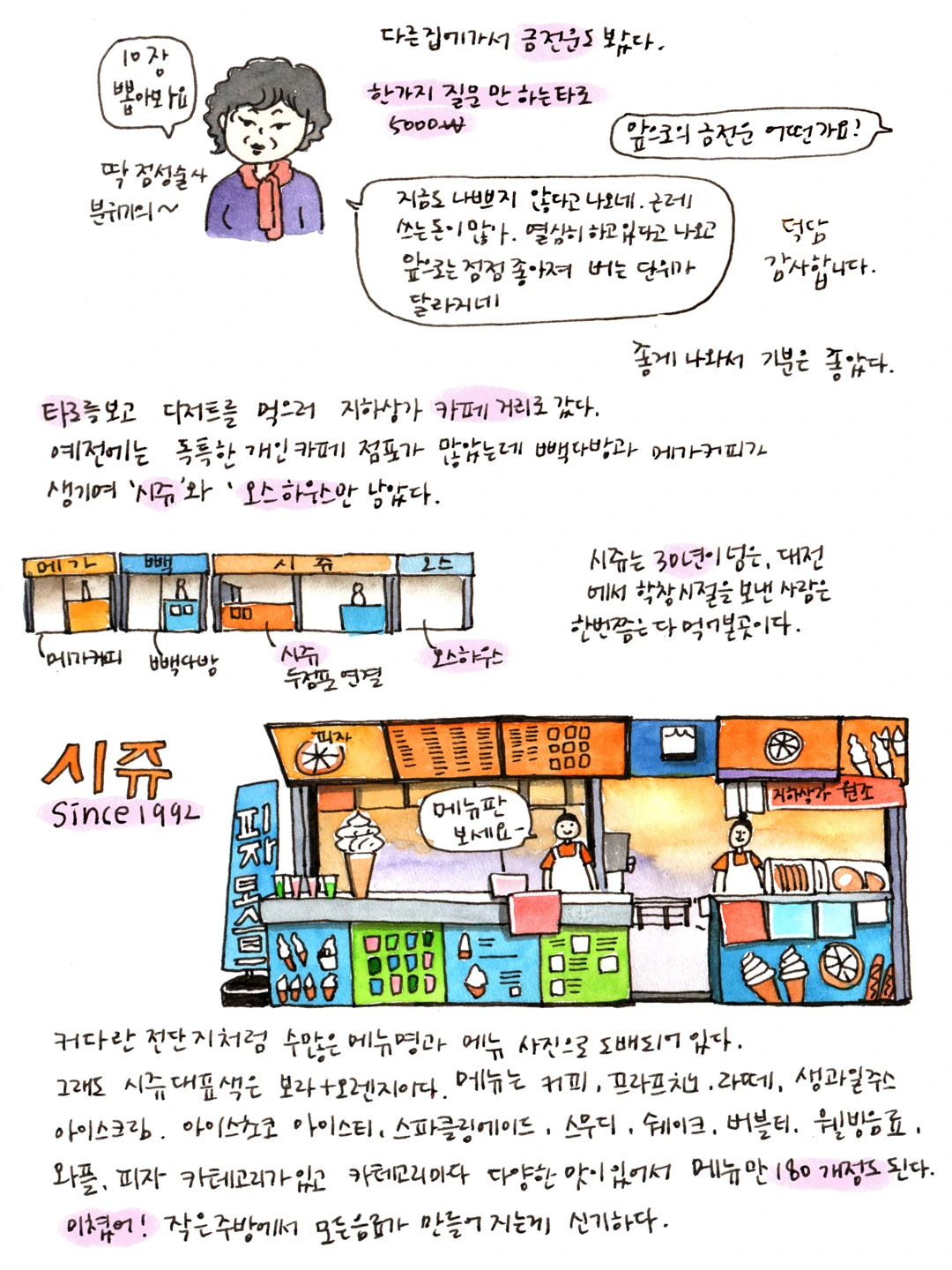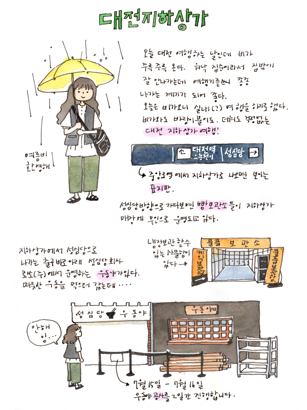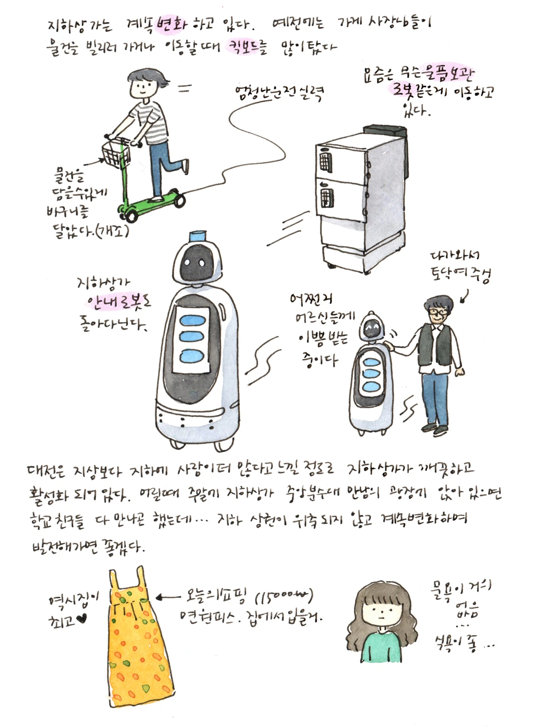 나는 참말로 대전 지하상가가 좋다. 시원하고 밝고 깨끗하게 정돈되어 있으며 다양한 연령층이 모여 생동감이 든다. 브랜드의 옷집들은 주로 지상에 있지만 보세옷과 신발, 액세서리등 가볍게 구경하고 쇼핑하기 좋은 곳은 거의 지하에 모여있다. 요즘은 지하상가의 분위기도 많이 달라졌다. 온라인 쇼핑이 많아져서인지 물건을 파는 곳이 줄어들고 체험 위주의 속눈썹 시술, 네일아트, 타로, 점보는 곳이 늘어났고 키링자판기, 인형 뽑기, 물품보관소, 네 컷 사진 찍는 곳 등 무인점포도 많아졌다. 그래도 여전히 만남의 광장 분수대에서 친구와 만나 서로 어울리는 옷을 골라주며 쇼핑하고, 입어보고 안 맞는 옷은 지하 곳곳에 있는 옷수선 상가에서 줄여 입는다. 새로 산 옷을 입고 신나서 돌아다니다 지치면 시쥬에서 산 주스를 먹으며 지하 휴게장소에서 한참 수다를 떨기도 한다. 지하라서 해가 느껴지지 않아 시간이 가는 줄 모르고 놀다 보면 점포들이 하나 둘 문을 닫기 시작하고 사람들은 중앙로 지하철역으로 몰려든다. 성심당 빵봉지와 쇼핑한 물건들을 두 손 가득 들고 탄 지하철은 빵 냄새와 함께 오늘의 이야기로 가득하다.