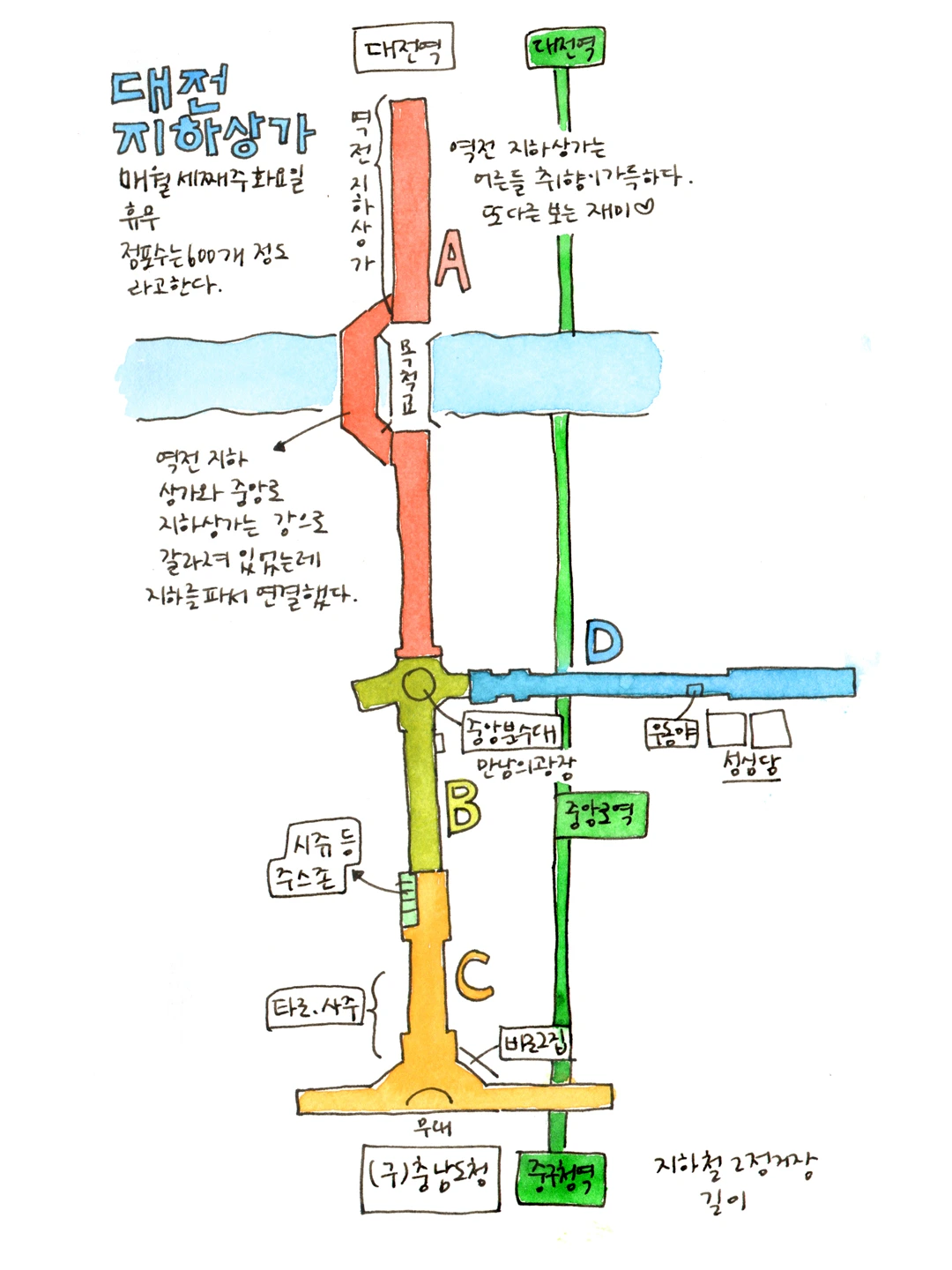비가 와도 눈이 와도 더워도 추워도 하루를 즐겁게 놀 수 있는 장소가 되어주는 대전의 지하상가. 변화하는 시장에서 새롭게 적응하며 더더욱 발전했으면 좋겠다. 그런데 어째서 지하상가 마스코트 룰루와 랄라는 두꺼비인 걸까?? 두더지로 됐지 않아?