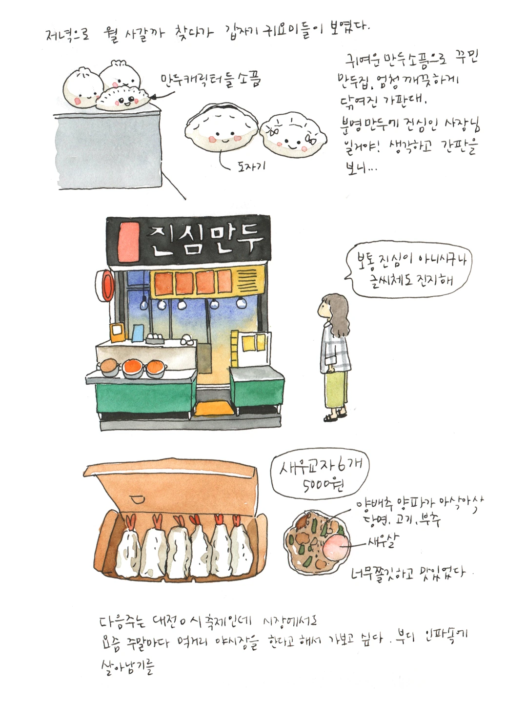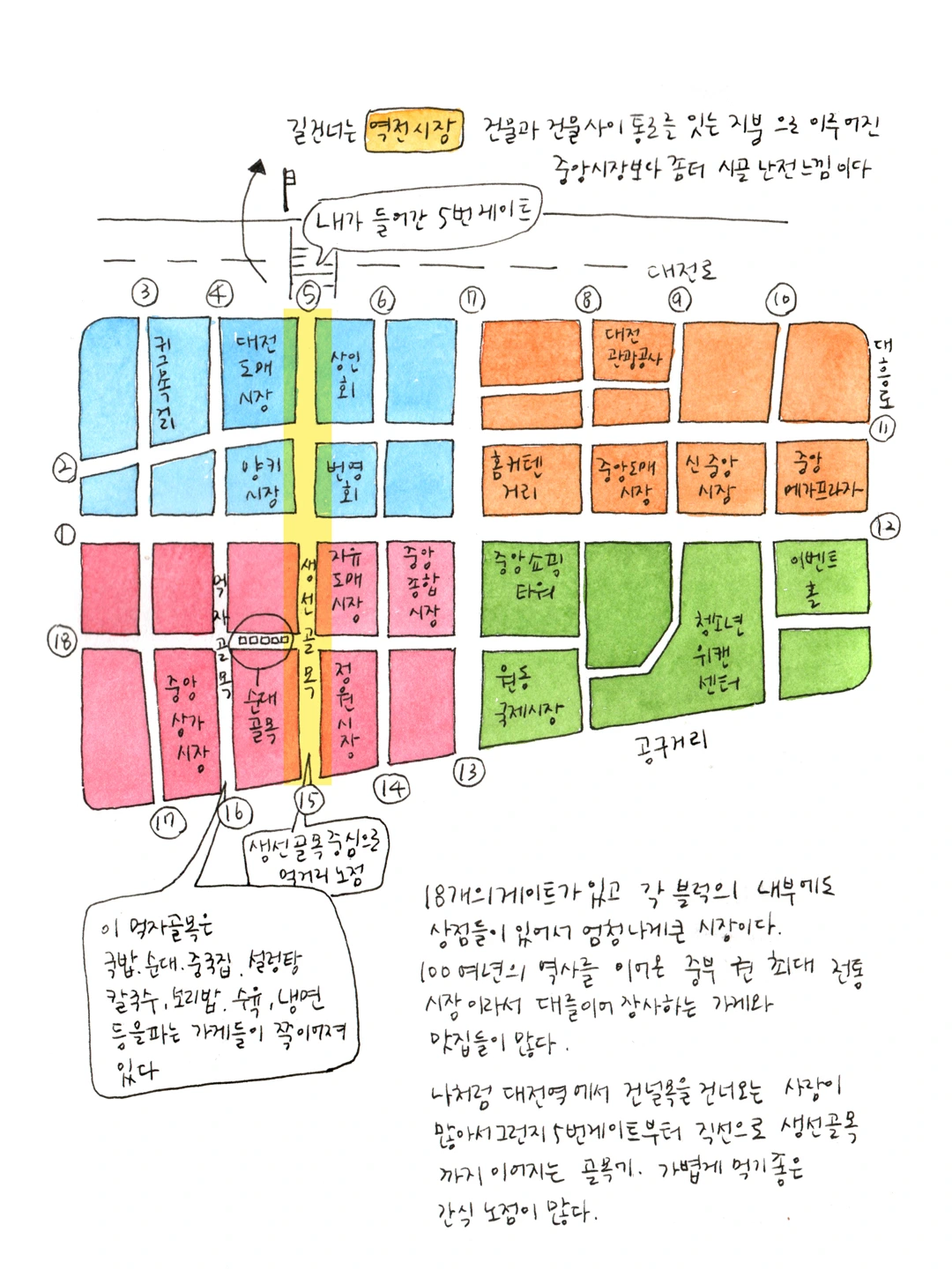 대전 중앙시장은 대전다운 시장이다 정리가 잘 되어있고 경적이 울리지 않는 대전답게 시장도 호객행위가 거의 없고 소리 지르는 사람이 없다. 가격도 크게 들쭉날쭉하지 않은 적당한 정찰가이다. 상인분들은 느긋하시고 잔잔하게 호의적이시라 나처럼 내향인이 가기에도 부담 없는 기운이다. 현금을 들고 가면 거의 1000원이 할인되는 곳이 많아서 현금을 뽑아가면 좋지만 카드도 잘 받으신다.