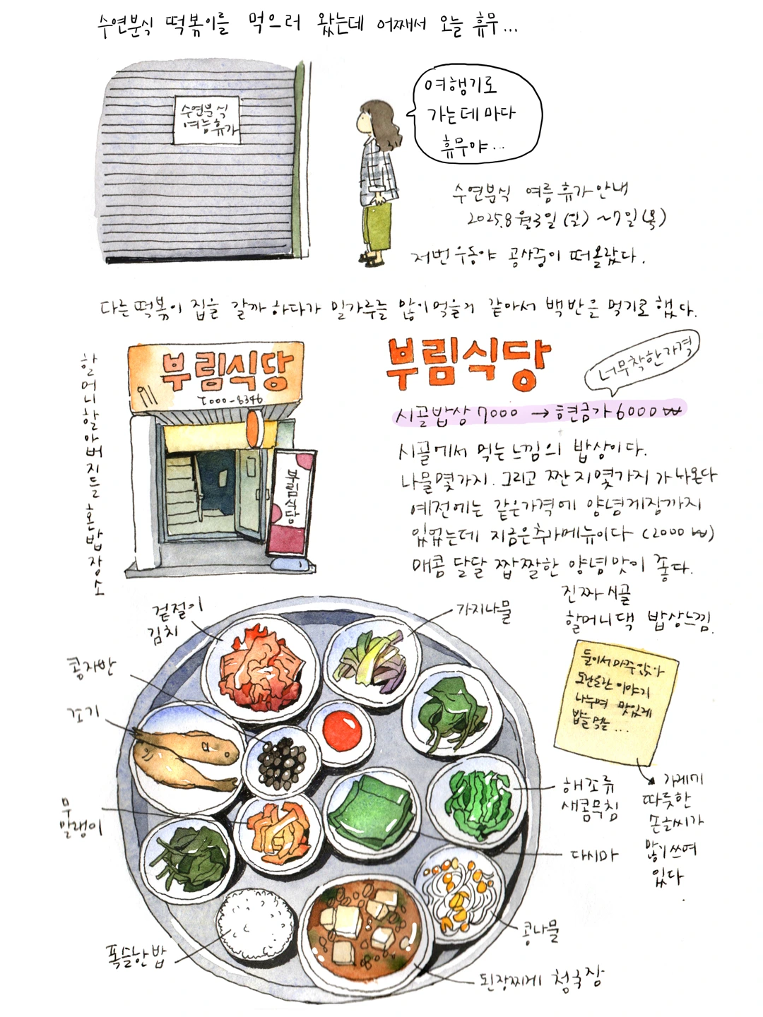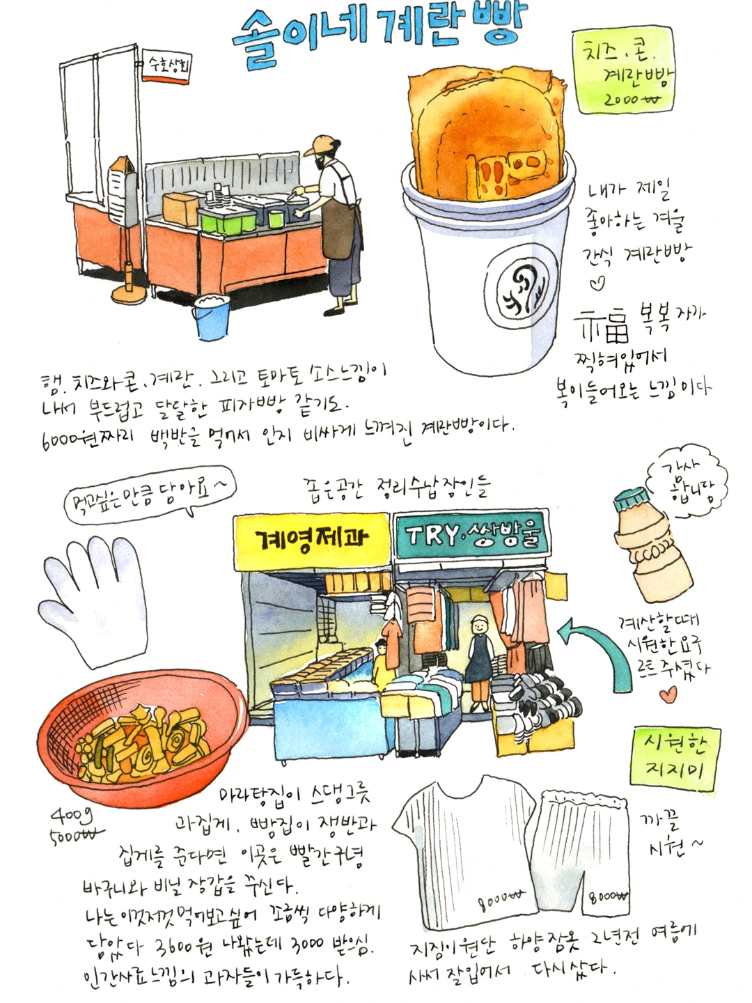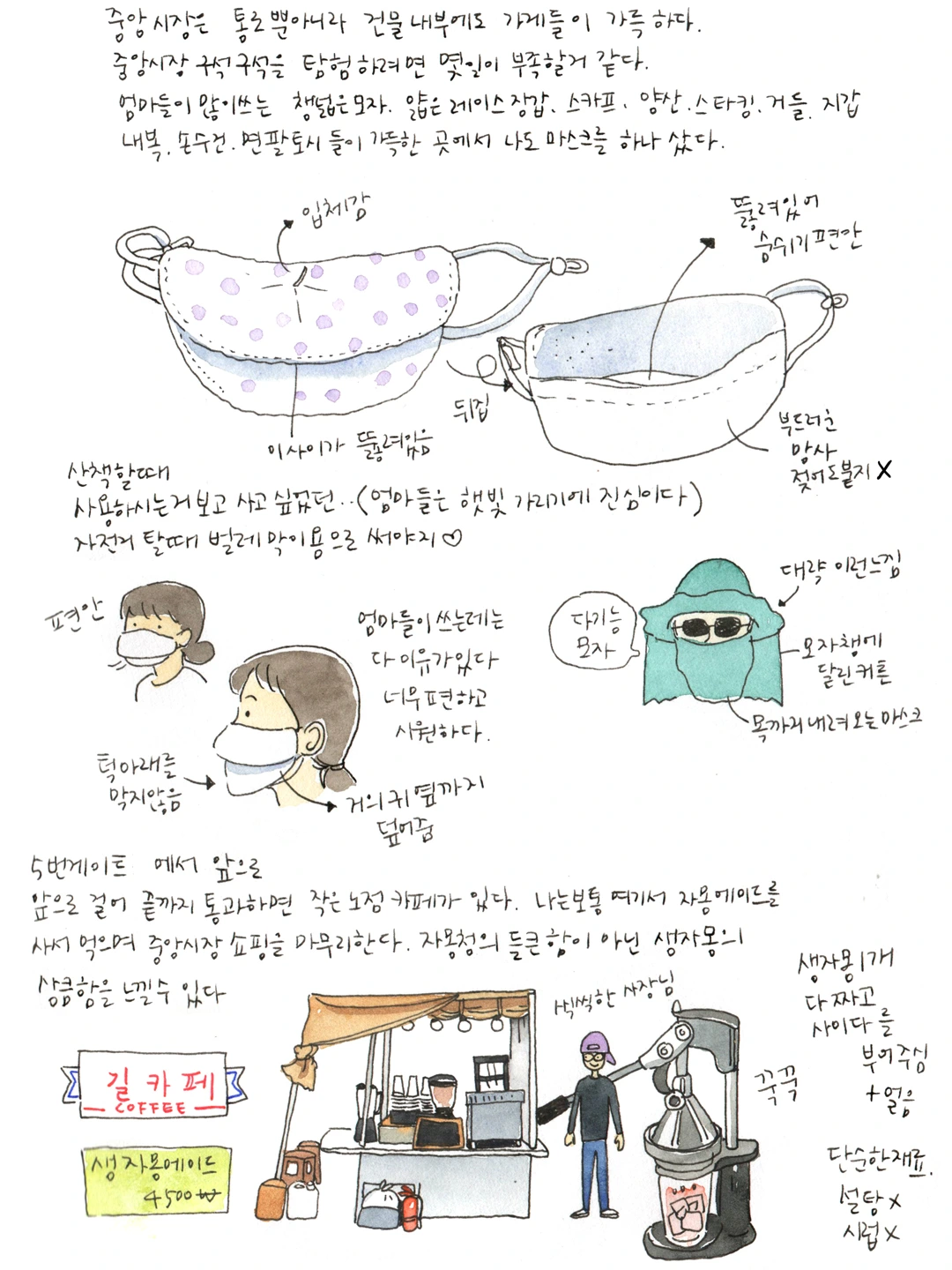 나는 주로 5번 게이트에서 직진하는 길을 애용하는데 나 같은 사람이 많은지 그 길에 간식거리나 떡볶이집이 모여있다. 하지만 갈라진 길들 사이사이에 열심히 장사하는 분들이 가득하고 신기한 물건들도 많아서 탐험해 보고 싶은 욕구가 항상 있다. 블록을 이루는 건물의 내부와 2층에는 여기에 무엇이 있는지 아는 사람만 찾아갈 수 있는 가게들이 줄지어 있다. 아마도 상인들의 상점 도매상이겠지? 젊은 사람들은 점점 모르는 장소가 되어가는 시장 구석이 최대한 오래오래 살아남으면 좋겠다. 인터넷 쇼핑으로 조명받고 잘 찍힌 사진만 보다가 더미더미 쌓여있는 물건들과 오늘도 열심히 가게를 지키고 계신 사장님들, 노점과 커피수레들을 보니 멀어져 있던 현실감이 올라가는 기분이다. 요즘은 온라인으로 물건을 사고 영상을 보며 간접 경험을 하고 내가 속한 바운더리 안에서만 맴돌며 움직였는데 제철의 식재료를 만지고 죽은 생선들 미끈한 생닭의 비릿한 냄새를 맡으며 삶의 현장감이라는 것을 너무 등한시한 게 아닐까 하는 생각이 들었다. 시각, 촉각, 청각, 후각으로 느끼는 감각의 중요성을 느꼈고 원초적 생명력이 충전되는 기분을 느꼈다.