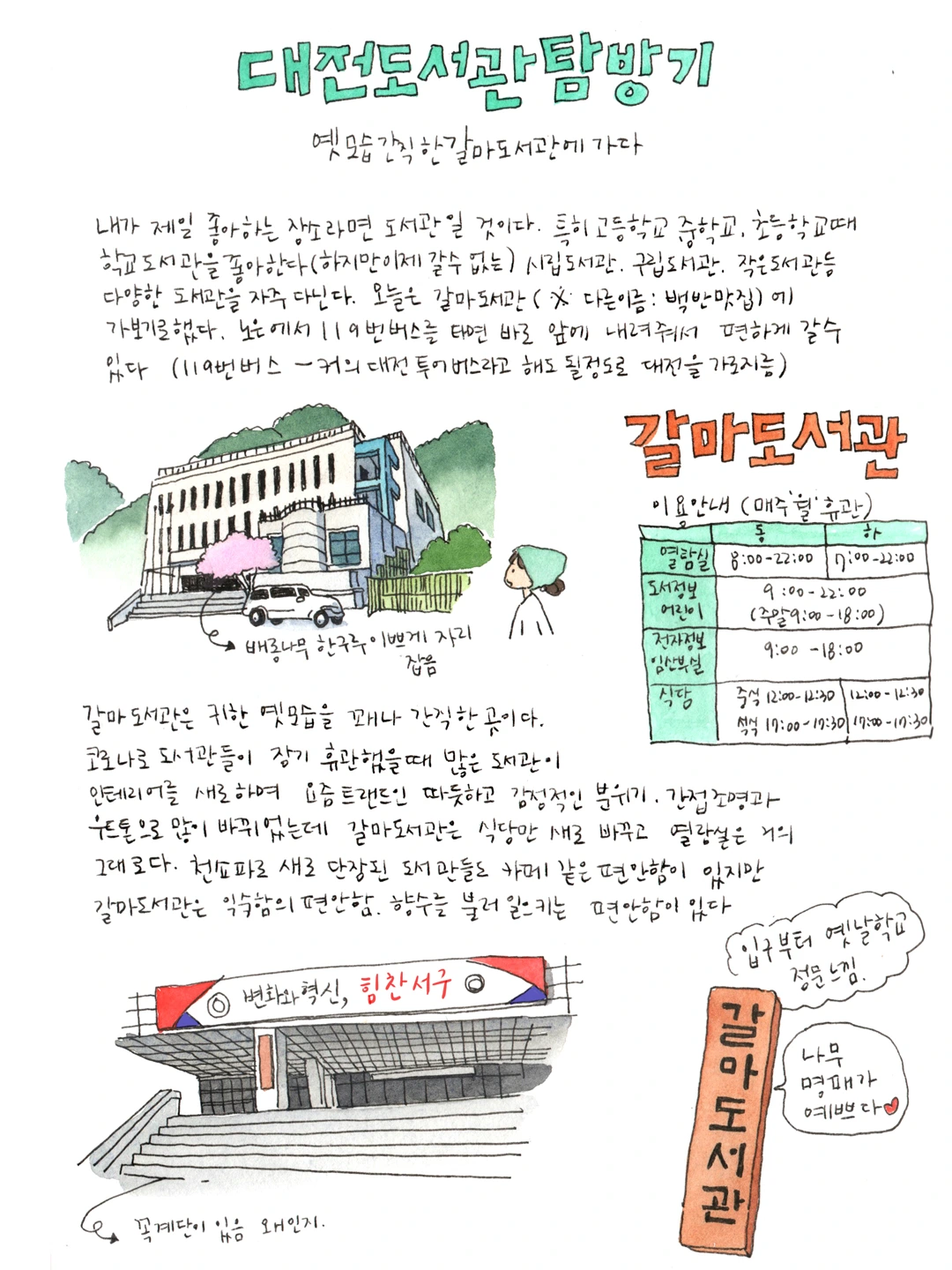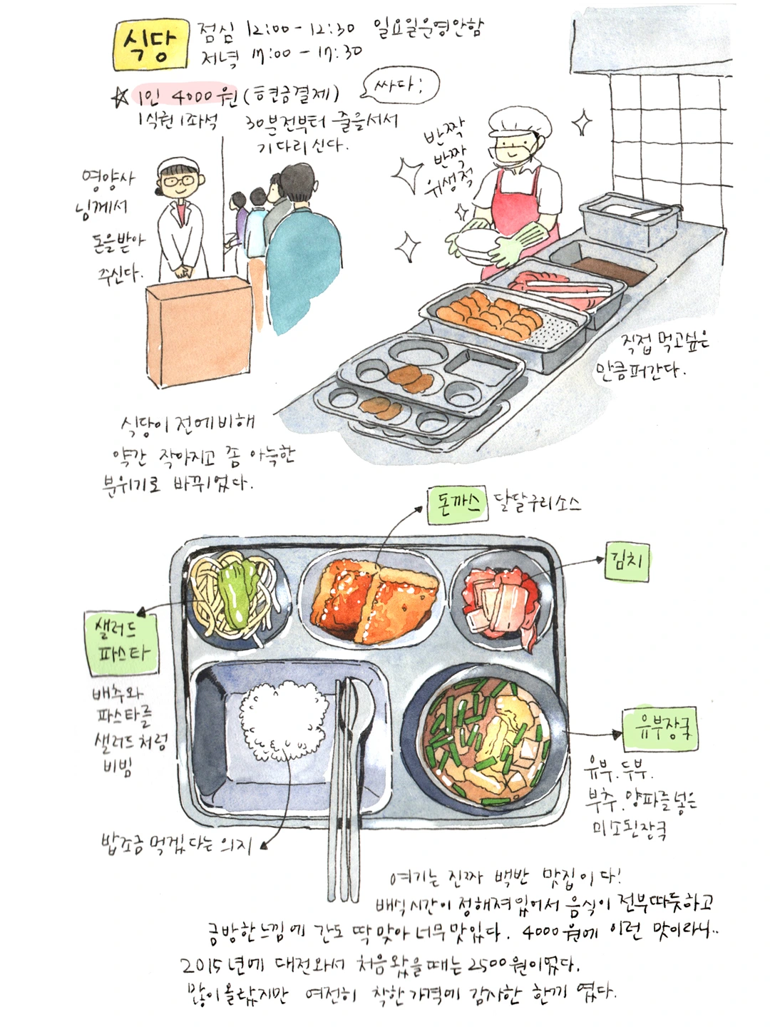 이 멋진 합주단의 연주에 맞춰 군무를 추러 갈마 도서관에 방문해보고 싶지 않으신가요? 매일 바뀌는 간소한 반찬들은 방금 만들어 배식하기 때문에 따듯하고 맛있습니다. 일요일은 식당이 운영하지 않습니다.