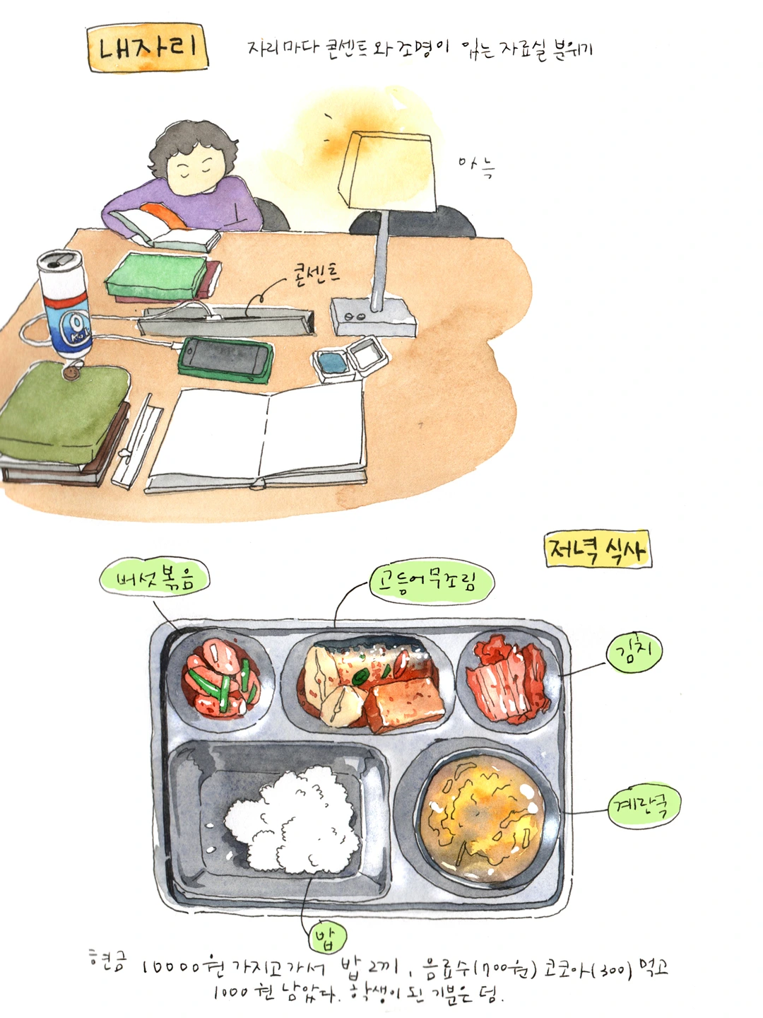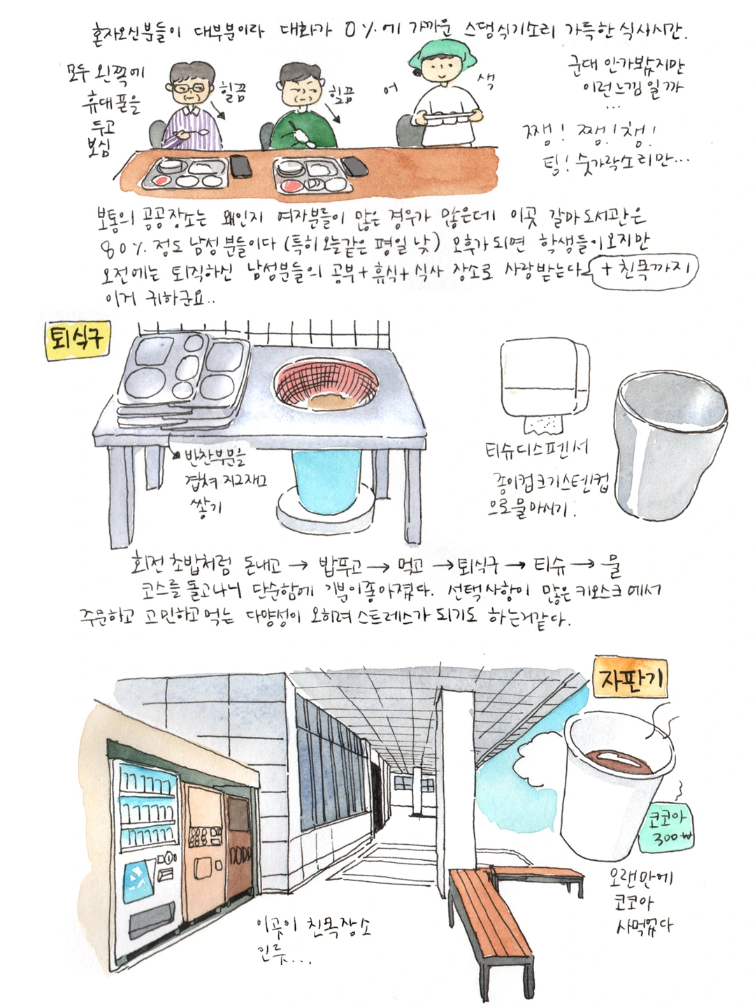 식당은 천장이 열람실에 비해 1미터 정도 더 높고, 긴 식탁에 민트색 등받이 의자를 마주 보게 두 줄로 배치한 8~90명 정도가 한 번에 식사할 수 있는 공간이다. 배식을 받기 위해 줄을 서서 식당 안을 둘러보며 뭔가 기이함을 느낀다. 70%는 채워진 좌석에 많은 사람들이 밥을 먹고 있는데 아무도 서로 이야기를 하지 않는다. 심지어 아무도 그 흔한 핸드폰을 만지작거리지 않고 오로지 밥만 먹고 있다. 철식판에 철제 식기가 쨍쨍거리는 소리만 공간에 가득하다. 천장이 높은 공간에 소리가 울려 꽤 소란스러운데 사람의 음성은 없으니 공사장에서 무성영화를 보는 듯한 기분이다.